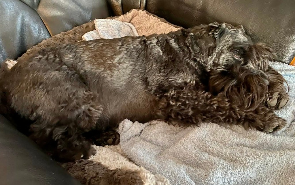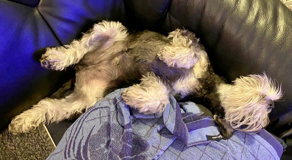 Troy tog sin favorit plats i fåtöljen. Nu inväntar vi in eftermiddagsfika, då får vi våra Dentastix.