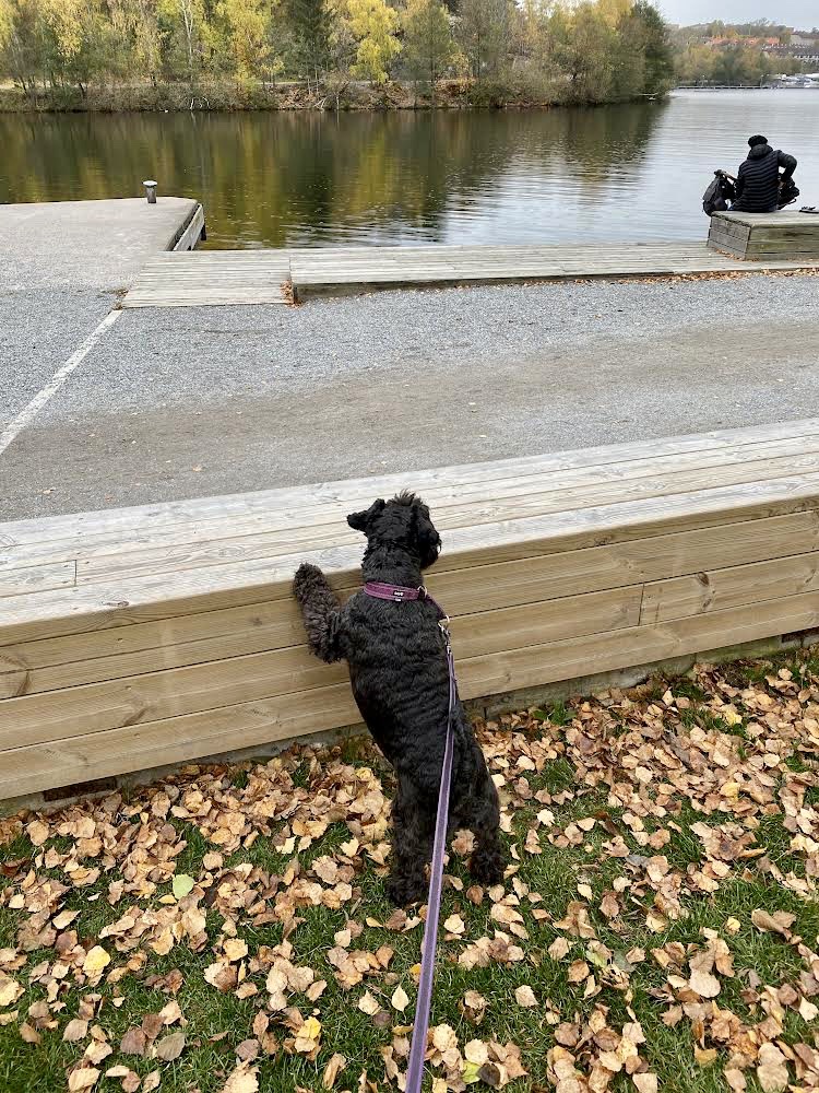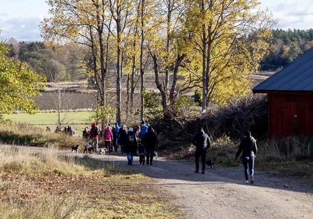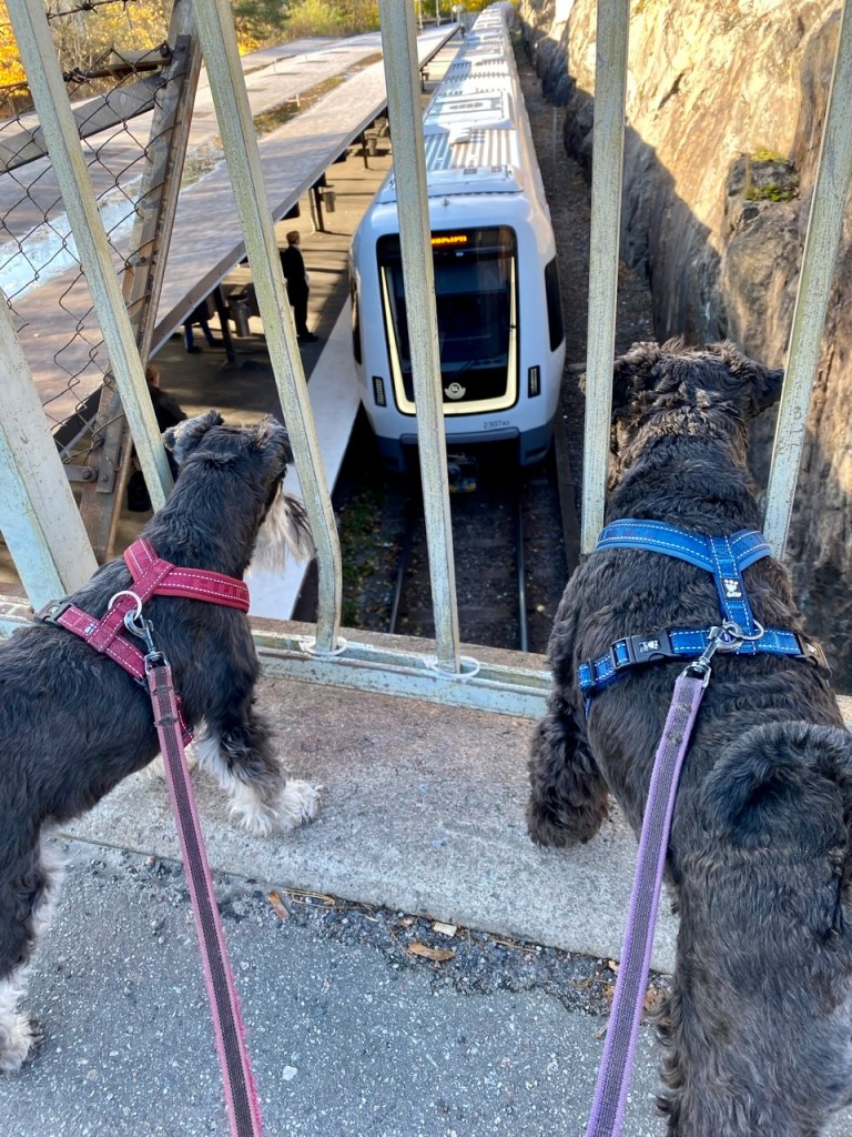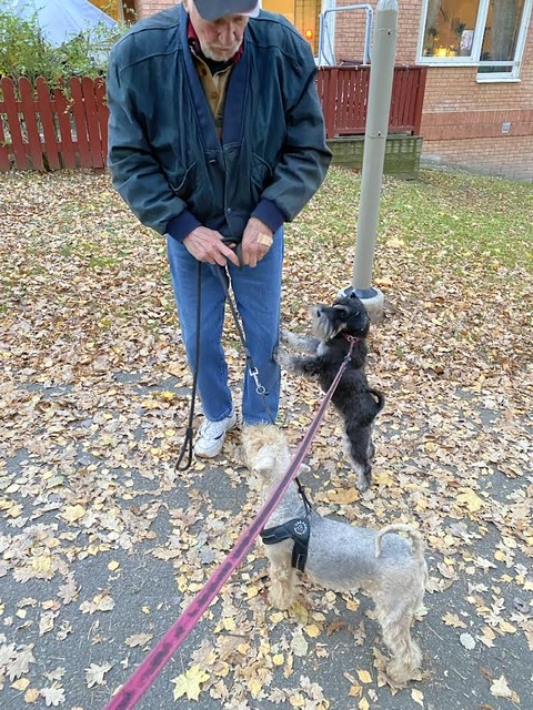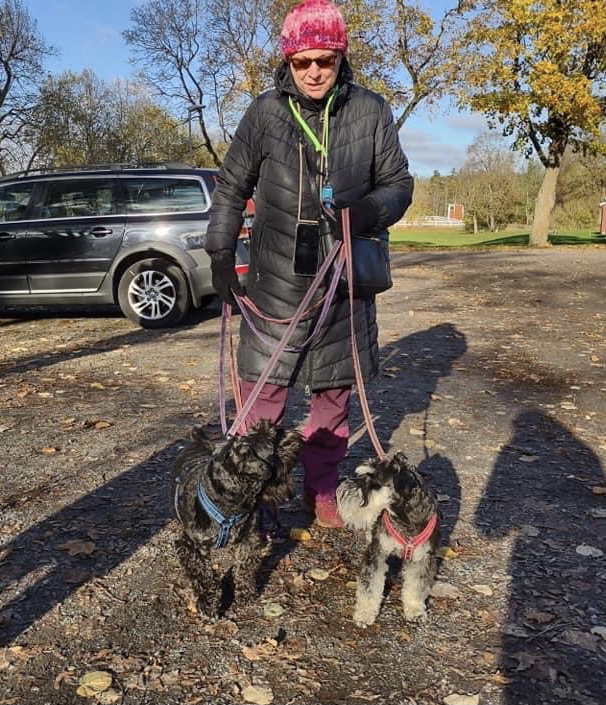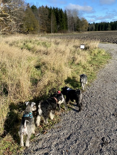 Något är på gång för skvallerdosorna har monterats på på våra selar. Vi packar in oss i bilen och efter ett tag i bilen ser vi att vi är i Berga. När husse parkerat bilen tjuter vi av otålighet för vi vet vad som väntar, en snuzzepromenad med fina söderortsgänget.