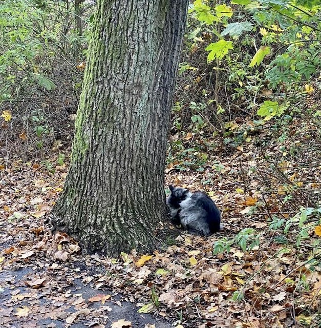Där, där….bakom ett träd ligger en katastrof och sover, mitt på ljusa dan! Har väl aldrig sett på maken de brukar bara vara ute sent på kvällen och natten. Den fick ett högljutt uppvaknande då vi gapade loss rätt rejält innan matte satte stopp för det roliga.