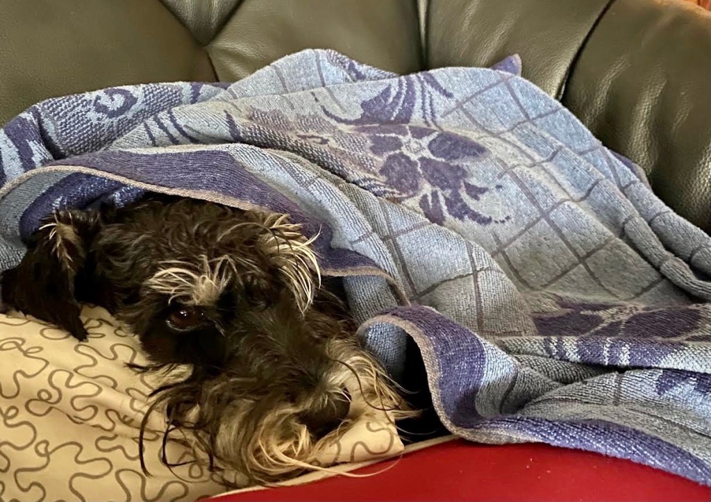 Helt plötslig började det regna och vi hade minst 2 km promenad hem. Vi var alla helt genomvåta när vi kom hem. Gudars vad jag frös. Matte gnuggade mig nästan helt torr med ett badlakan. Sen la jag mig på mina kuddar i soffan och eftersom jag fortfarande var lite ruggig så var det skönt när matte la en torr varm handduk på mig.