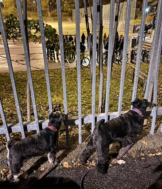 På idrottsplatsen har de något för sig i mörkret. De leker någon sorts ringlek. Vi står kvar en stund och tittar på.