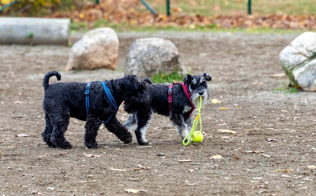 Vi åkte till hundhagen och där fanns redan en vovve. H&M pratade med hussen och alla var överens om att det gick bra att vi kunde vara samtidigt i hagen. Hon heter Layla av rasen Jack Russel och är 9 år, en pigg och rask dam. Vi hälsade på henne men ganska snart övergick vi till vår lek med snörbollen