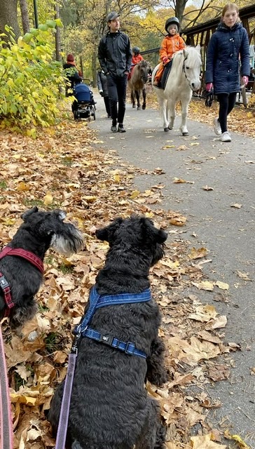 Ja ha där kommer de där stora fyrbenta åbäkena igen med människovalpar på ryggen. Matte säger att vi skall vara tysta och sitta fint vid sidan om parkvägen när de skall gå förbi. Men tusan hakar det är väl de som skall flytta på sig för en prinsessa. Flera av de vuxna tyckte vi var väldigt duktiga som satt där.