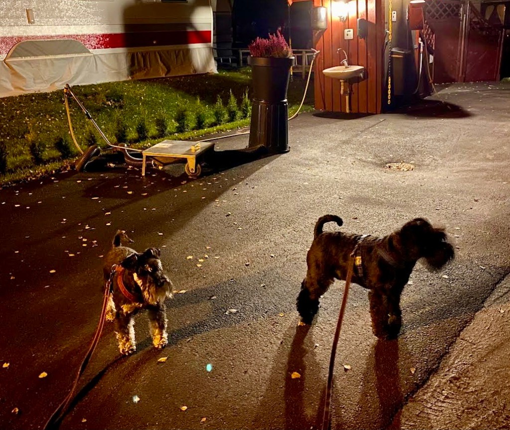 Tillbaka på campingen. Vi tar en patrullrunda och kollar av att allt är ok. Det är lugnt och vi tror att igelkotten har gått till vintervila. Det blir en tidig kväll för morgon är det tidig uppsittning så vi hinner till vår träff med skogsgänget.