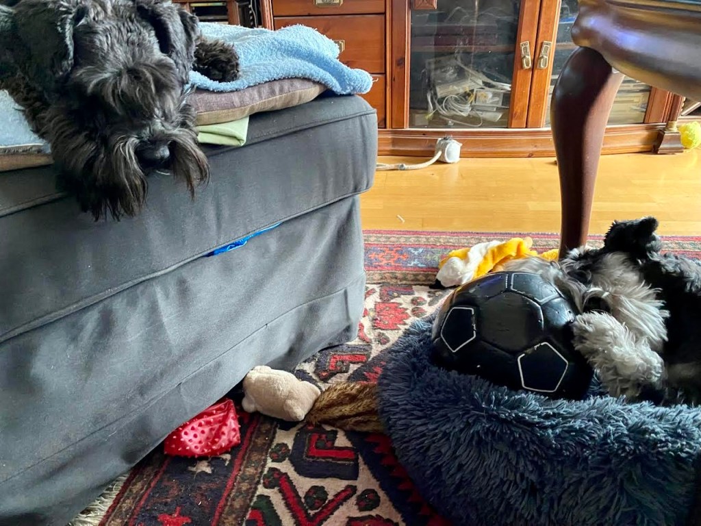 Hemma igen och nu var det dags att hämta Råttis från nattlägret. Med ett stadigt grepp tog jag honom till korgen under soffbordet. Här får han vara tills efter middagen då bär det av till sängen igen.