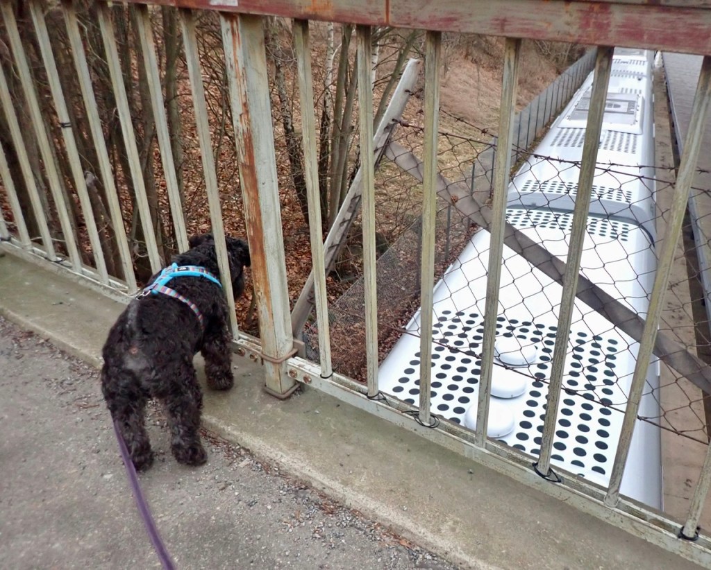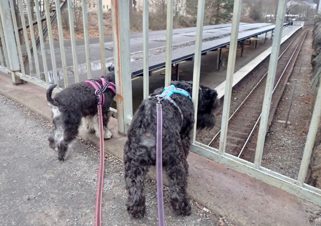 Tået mot stan hade precis gått och då hör vi att tåget från stan är på ingående på andra sidan om plattformen. Snabba ryck nu matte så vi hinner över till andra spåret! När föraren stänger dörrarna låter det, ett varnande piljud. Matte skrattar åt oss för vi vrider lite på huvudet fram och till när vi lyssnar.