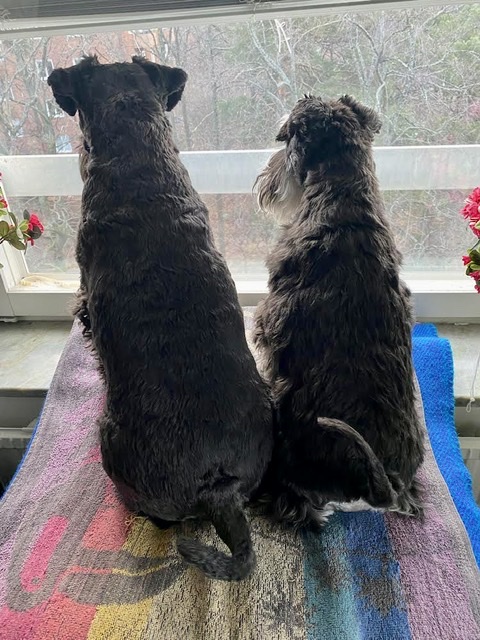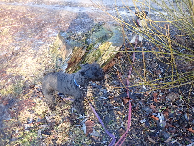 Troy vill gärna in i buskarna för det sitter några svarta trastar där inne. Jag ställer mig lite i från honom om vi nu skulle göra en gemensam attack. Tyvärr lägger matte in sitt veto mot det, tråkig mänska.
