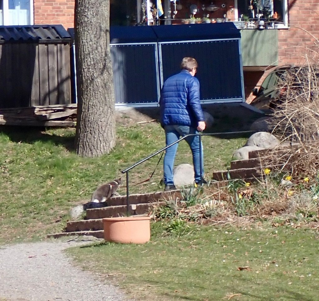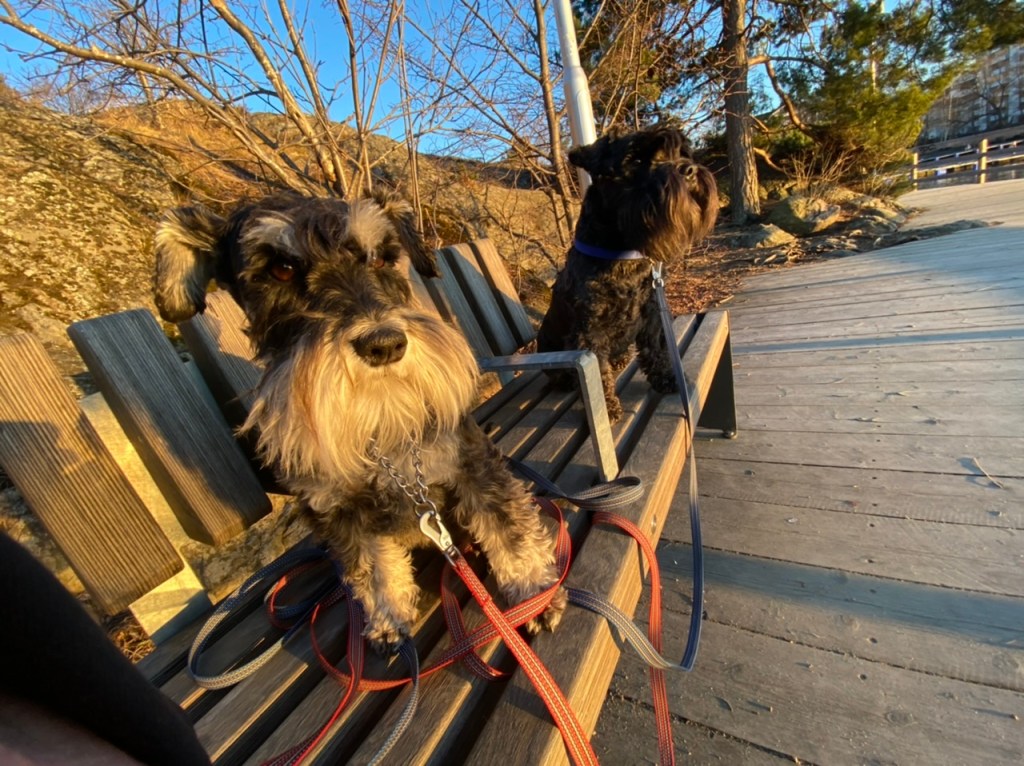 Matte och Wilmamatte Helena hade någon ide om att hjälpa våren på traven genom att utföra någon sorts soldans. Trams säger jag. Matte hon far runt och åbäkar sig på vår inglasade balkong. Moha jag vårstädar säger hon. Men sen, trot det om nu vill, när vi går vår kvällspromenad är det härligt väder, sol och inte så kallt. Det är läge för att sitta en stund i solen på bänken nere vid sjöberget, mysigt mycket mysigt. Matte och Wilma matte Helena fortsätt ni att dansa soldansen ni för det verkar fungera!