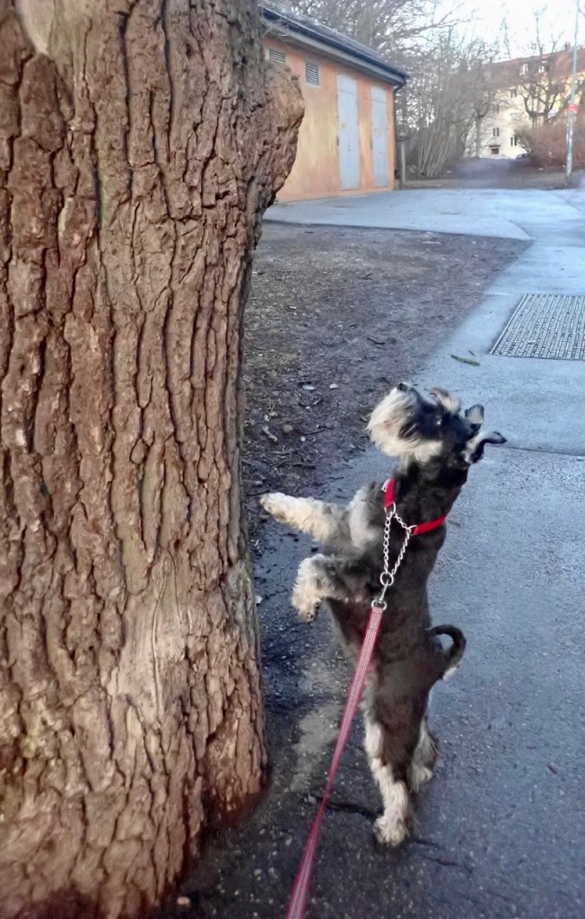 Lite spaning efter ekorrar längs vägen hinner vi med. Det är min kompis Wilma som visat mig hur man gör. Jo då den är där uppe, jag ser den.