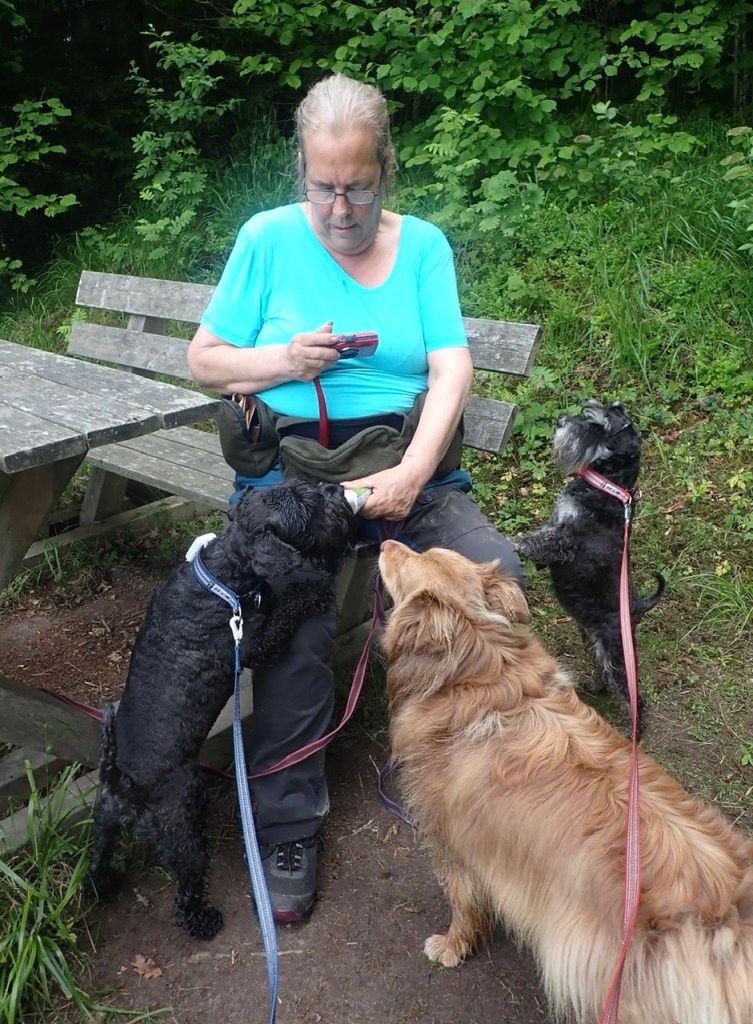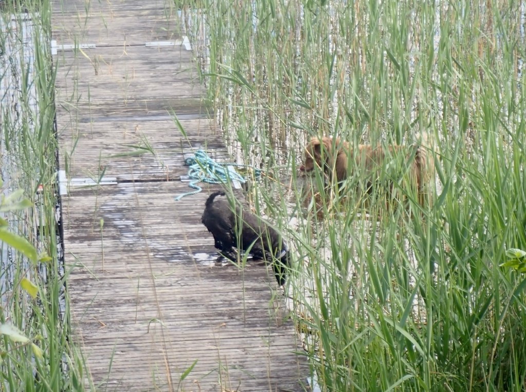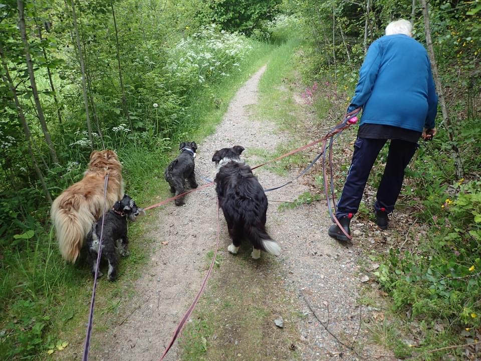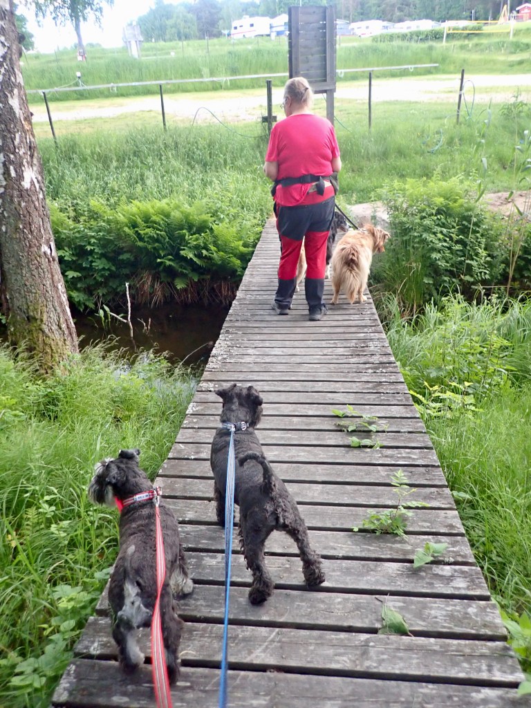 På vägen tillbaka går man över en liten bro. Vissa badgalningar försöker hoppar i men tvåbeningarna har ett stadigt grepp och korta koppel. Turen avslutades med ett besök vid hundbadet. Sjövatten är väldigt gott och killarna fick sitt dopp.