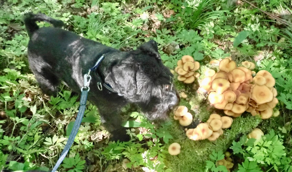 Vi har en härlig förmiddagstur då vi kutar runt på vår favorit äng. Basse stack iväg och hämtade ett revben som han gömt vid ett tidigare besök. Troy som gillar att jobba markerade en stubbe med massor av stora tofskivlingar. Tråkigt nog hade matte glömt osttuben, hur man nu kan glömma den förstår jag inte. Han fick massor av beröm och gotter så han var nog nöjd ändå.