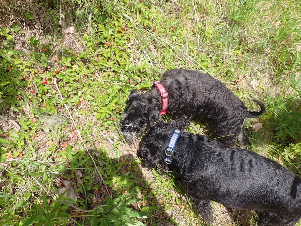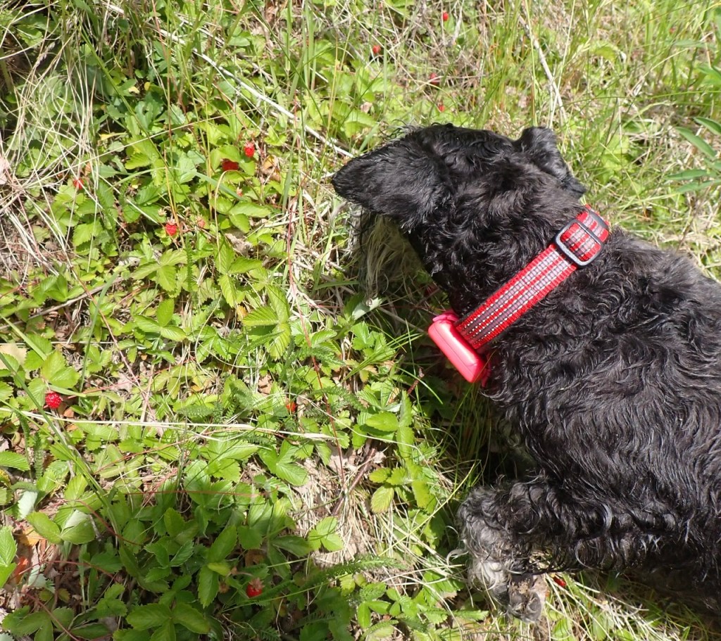 Matte visar Troy smultronen och snart plockar han också. Matte är snäll och låter oss stanna en stund. Ja mattarna plockar lite också. Det finns så mycket att det räcker till alla.