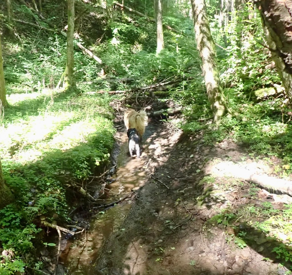 På vägen tillbaka till bilarna passade vi på att dricka lite i den rinnande bäcken. Troy sköljde igenom skägget och tassarna. Han undrade om det räcker så för att matte skulle bli nöjd.