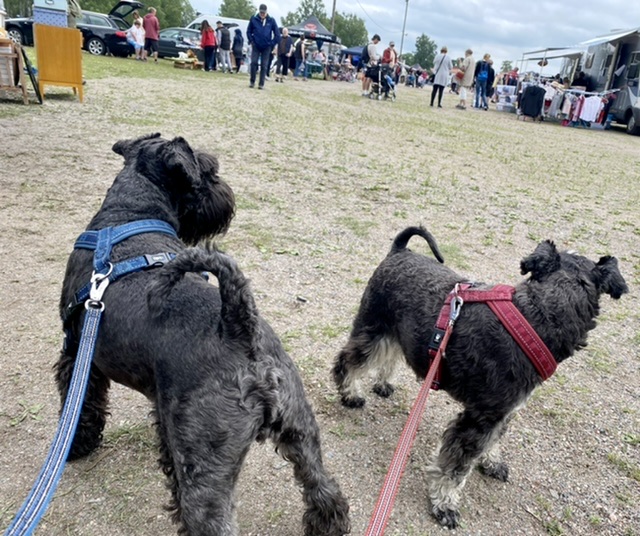 Lördag och vi tar en lugn promenad. När vi kommer upp till Heden är det massor av folk där. Det var bakluckeloppis och matte ville hovra runt lite. Vi skötte oss så bra att vi fick lite godis.