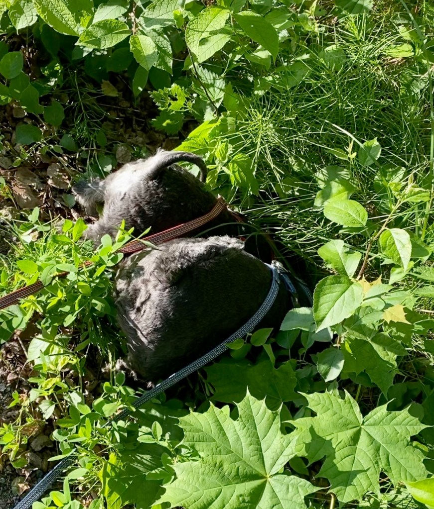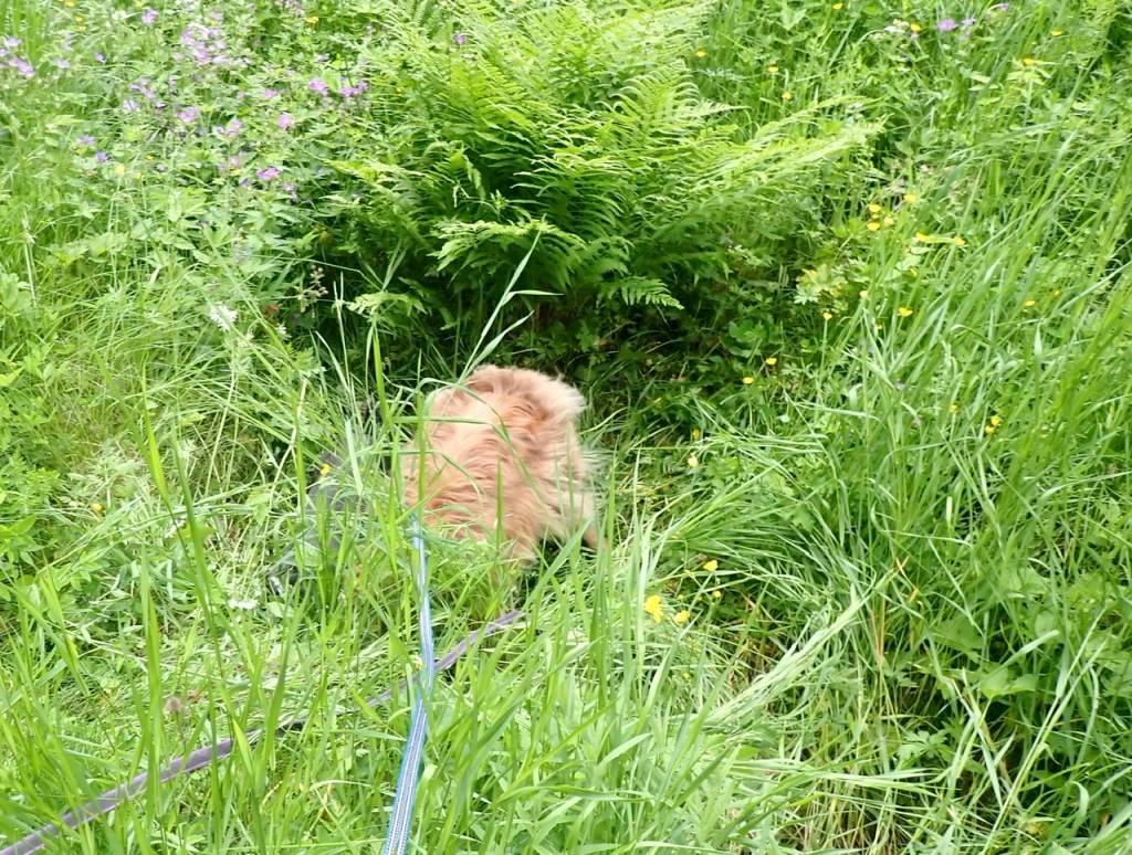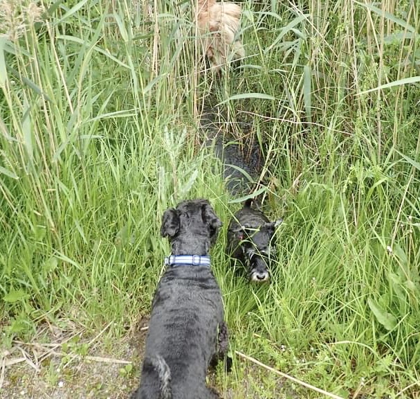 Troy for ned i ett dike med en väldig fart och började grymtande gräva som en galning. Basse var inte sen i att dyka ned i samma dike. Troy har grävt sig in en bit i växtligheten och man ser bara hans koppel, men han finns där nere. Basse gräver åt andra hållet.