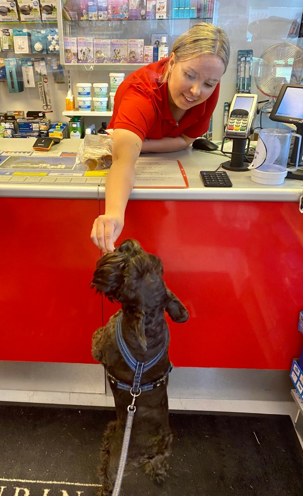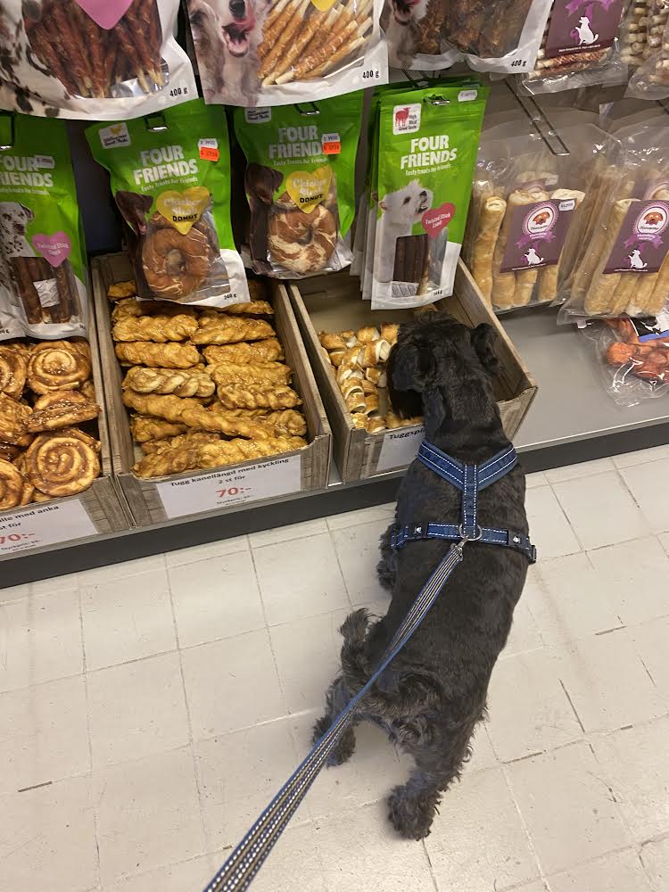 Så nu har jag bestämt mig. Jag sätter mig ned och pekar med nosen på mitt val. Sen gick vi till i kassan och jag sa, två torkade strupar tack. Ser ni dem de ligger där på kassadisken. Hon som stod i kassan har hamnat på rätt plats för hon såg att jag behöver lite godis. Hon hade en hemlig gömma bakom disken som hon delade med sig av. Vilken underbar butik.