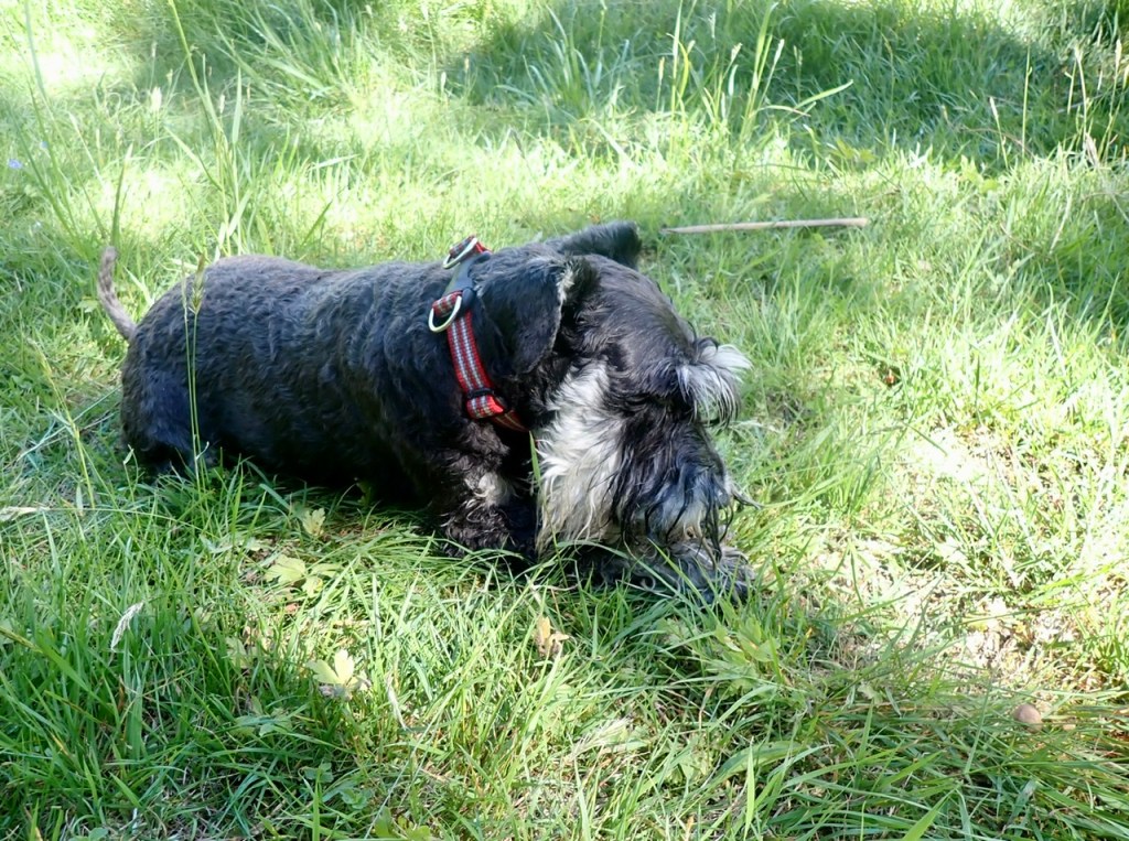 Nu va…. nu… är botten nådd, på mer än ett sätt. Basse och Troy är upptagna med sorkjakt på ängen ned mot badet så jag passar på att ensam smyga ned i Basses lerdike för att dricka lite. Plötsligt kommer Basse farande i 180, han upptäcker mig där jag står nere vid dikeskanten och han försöker desperat att undvika en frontalkrock. Jag har tidigare sagt i från på skarpen att han skall hålla sig undan från mig när han kommer rusande. I sitt försök att inte krocka med mig står han på öronen, slår en frivolt och landar i lerdiket samtidigt knuffar han till mig mycket lätt. Men knuffen var tillräcklig för att jag skall fara i vattnet och det med hela kroppen. Fatta va…. jag vill inte bada, jag ville bara stå i kanten och dricka lite fint. Evigt sur i dubbel bemärkelse tar mig upp ur diket. Basse tar det säkra för det osäkra och går åt andra hållet.