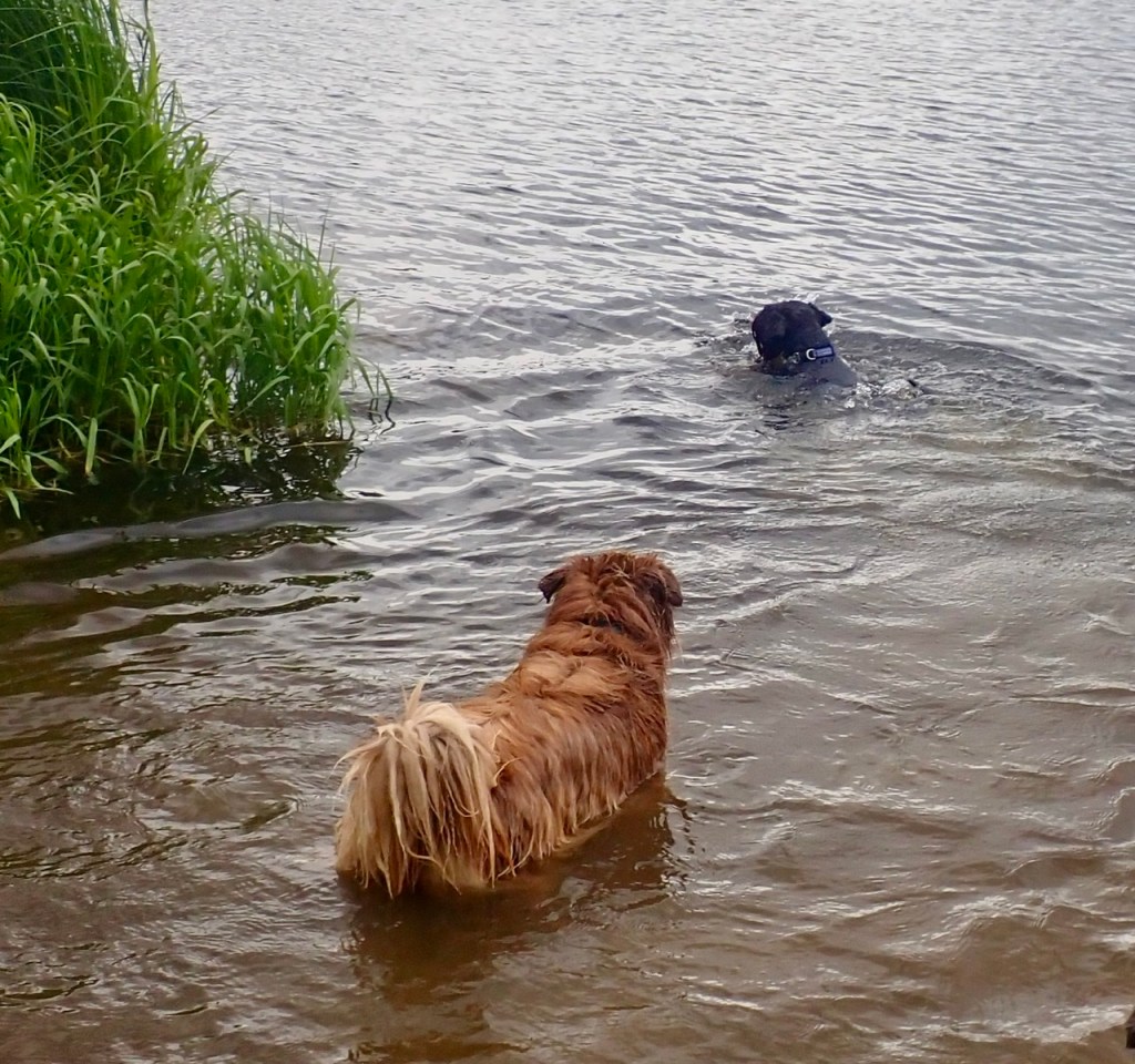 Vi går vidare till stranden för det är dags för en mycket kort dopp. Troy simmar så bra att det skummar om honom. Basse kollar noga på sin kompis som han har visat att det är härligt med en simtur. Jag…. ja jag har badat nog för en bra tid framöver.