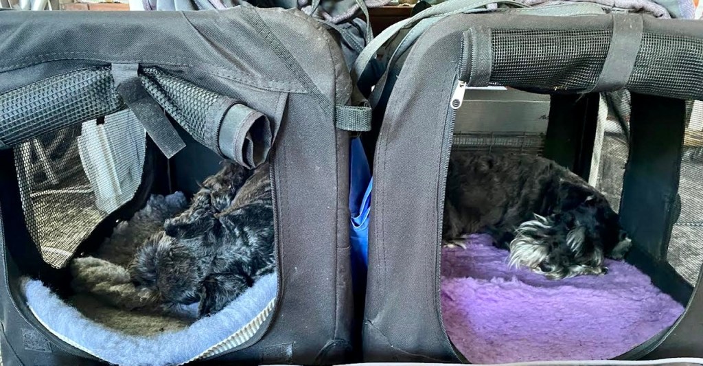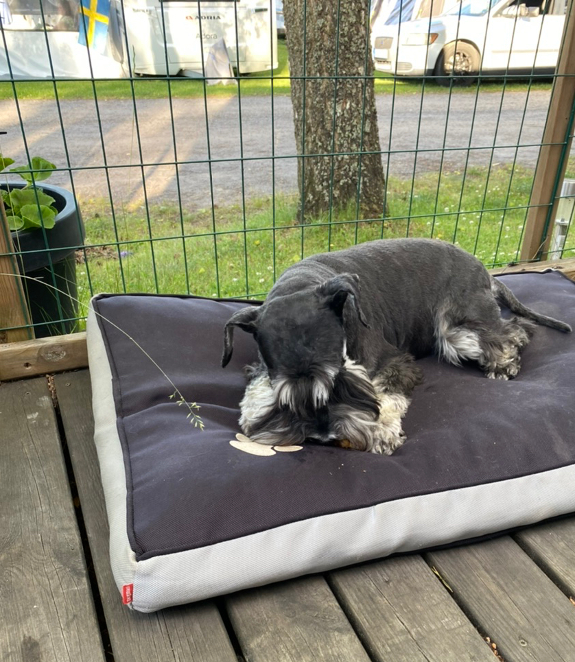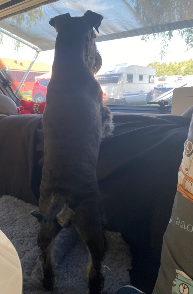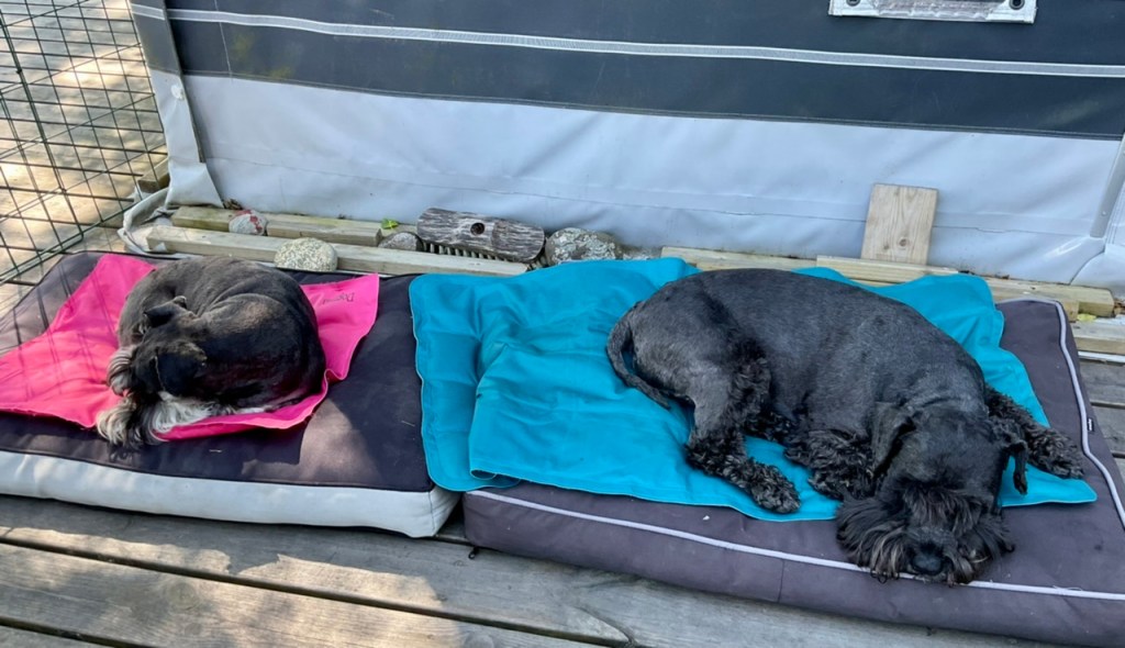 Man blir trött av att gå på hundträff och att vakta växthus för att inte tala om att ha koll på matte. När vi kommer hem till vagnen tar vi varsin koja i besittning och nu skall här vara tyst på campingen, basta.