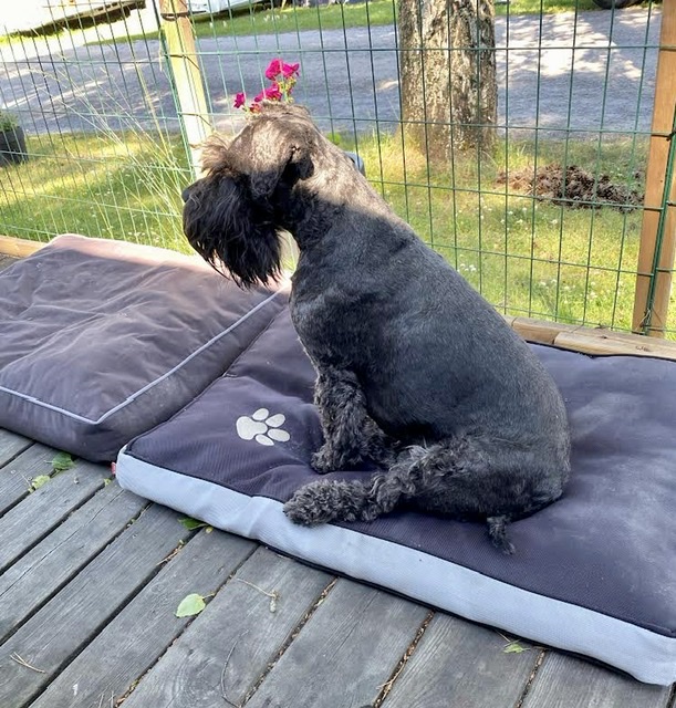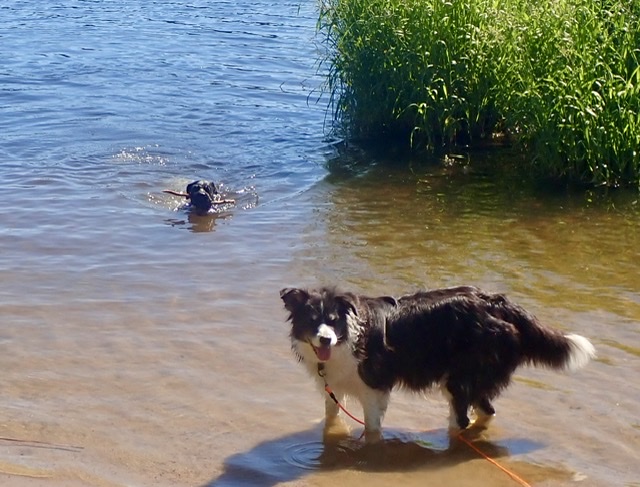 En härlig sandstrand med staket runt om badplatsen. Det var lite långgrunt vilket inbjuder till vattenlekar. Basse blötte ned sin tjocka päls sen rullade han sig i sanden. Därefter upp i träflisen och rullade sig igen. Men Basse då suckar Helena…. Tror hon fick ägna stor del av kvällen med att plocka flis ur pälsen.