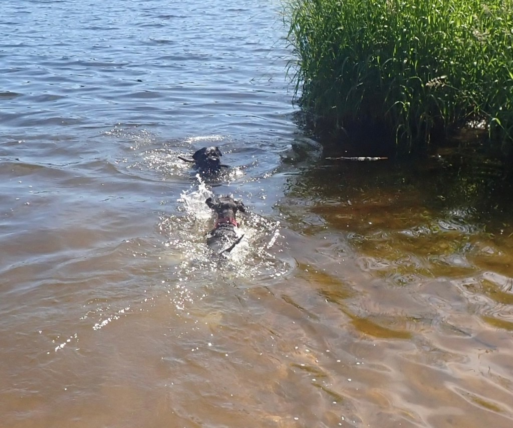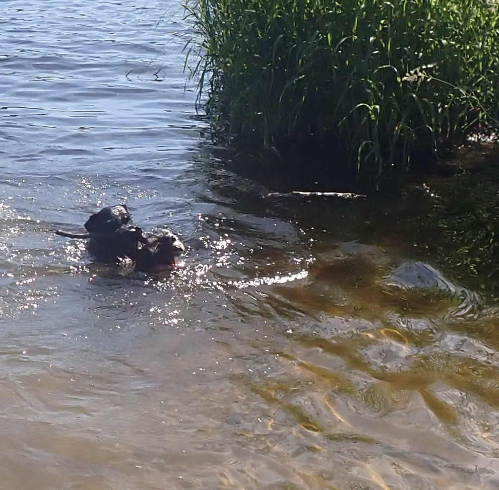 Troy har varit ute och hämtat en pinne så jag simmar ut och möter honom.