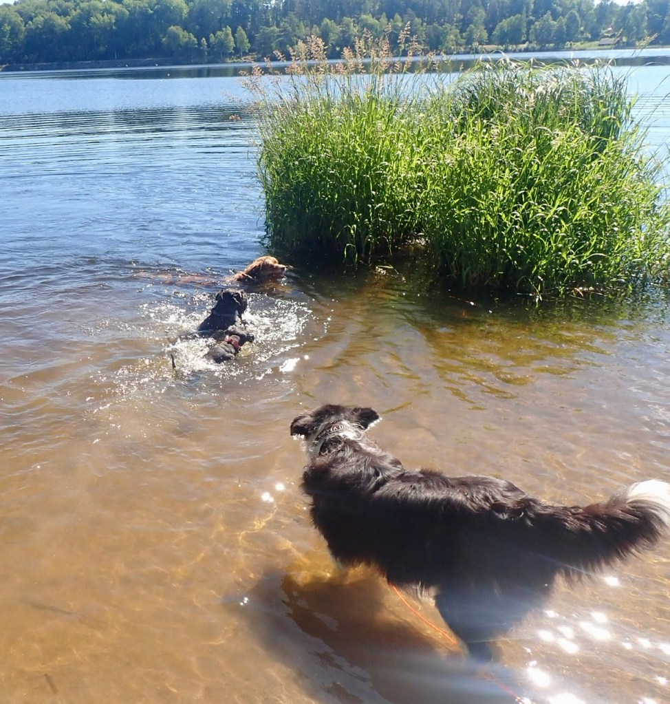 Nä nu blommar asfalten sa matte. Men Moha då, sa Helena. De var väldigt förvånad över att jag simmade iväg. Men nu är det så att den pinnen slängde matte i och då är den min. Jag tog pinnen från både Troy och Basse. Visade en halv huggtand och morrade lite för att markera att försök inte ta pinnen för då får ni spö. Men måste erkänna att det var skönt i vattnet cirka 23 g. Wilma hade noggrann koll på oss.