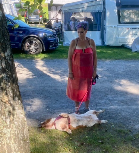 I vagnen bredvid oss bor en häftig brud som heter Dafne. Hon var på väg hem från campingens hundbad där hon tagit sig en simtur. Utanför oss stannade hon och la sig för ett lyckorull. Det är inte lätt att flytta på den tjejen. Matte säger att hundar kan förvandla sig till cementsäckar när helst de vill.