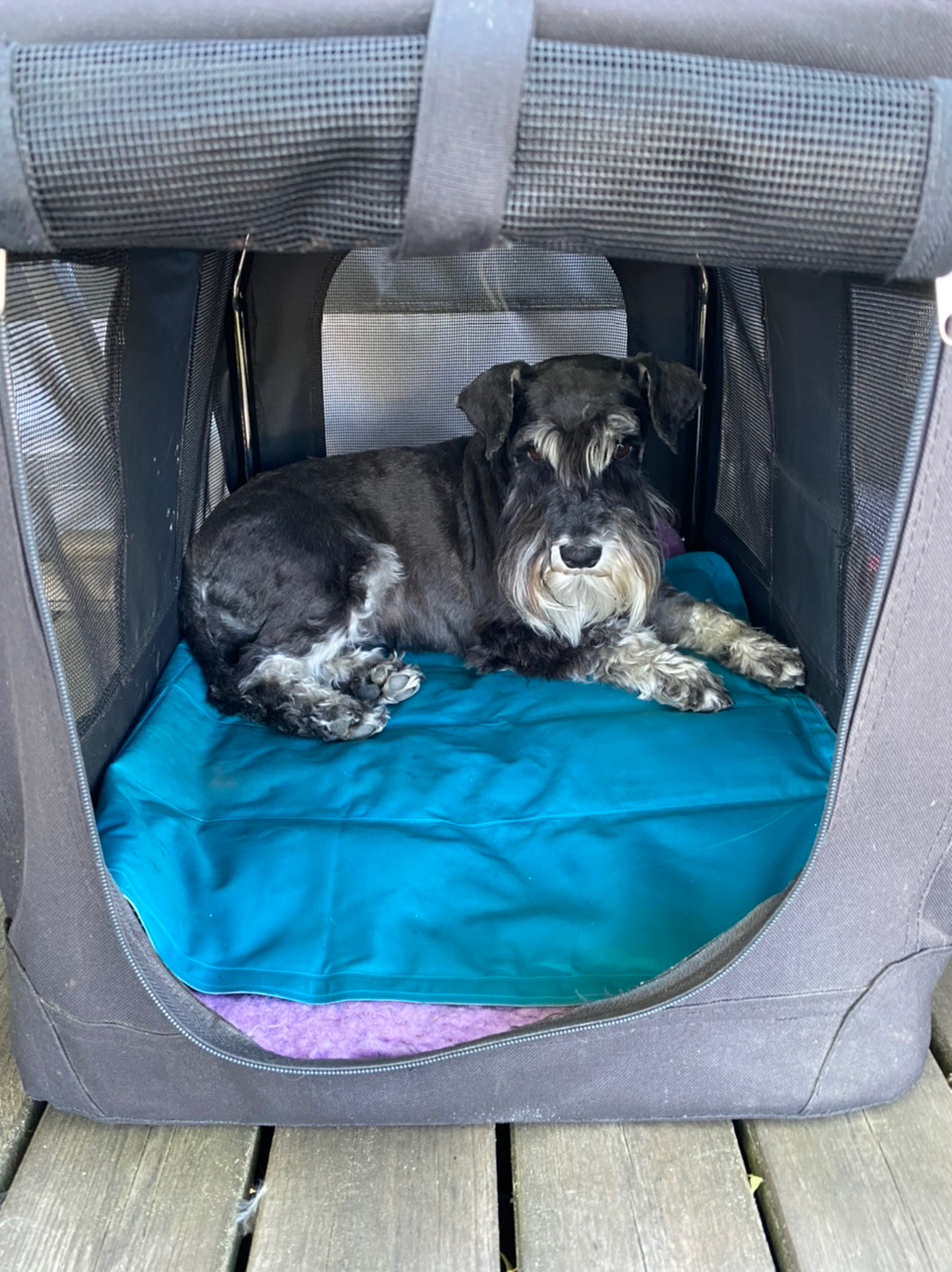 Det går inte att vara ute när det är 27 gr varmt! Nä nu går jag in i min koja där har jag en härlig kylmatta och här stannar jag. Matte kallar mig för gökuret för när det behövs skälla ut någon eller något så går jag bara ut med framkroppen sen när jag är klar med gapandet backar jag in igen.