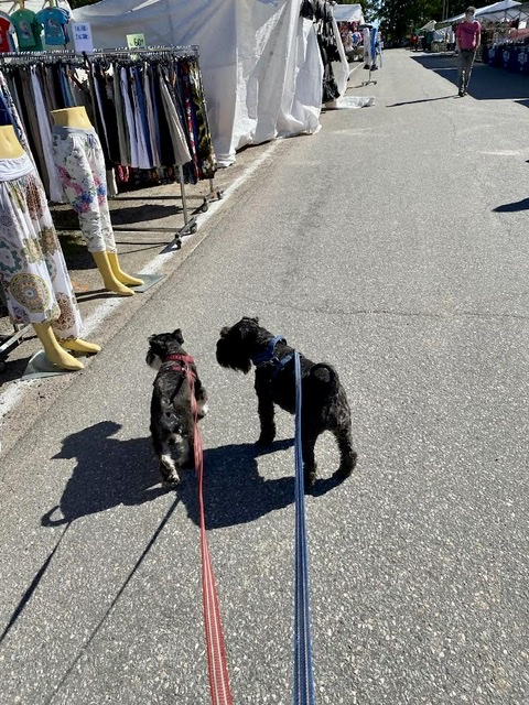 Nu pågår byggande av alla knallebutiker på Heden och vi tog en tur runt för att kolla in vad de sålde innan marknaden öppnade. På lördagen var det ren panik med 1,5 mil lång kö på alla landsvägar som leder till Malmköping. Vi stannade på campingen medans matte tog en sväng upp på marknaden. Solen gassade och matte sa att det var som att gå i en stekpanna så hon gav upp och kom ned till oss istället.