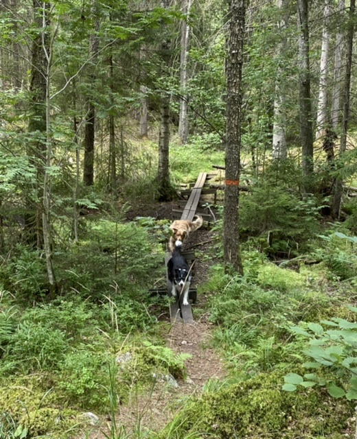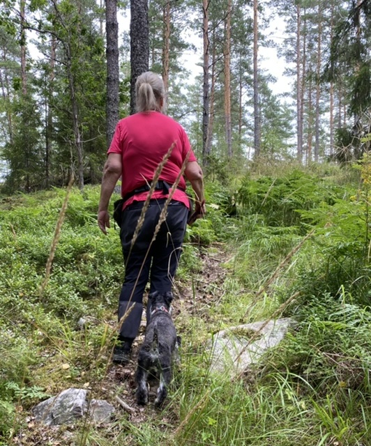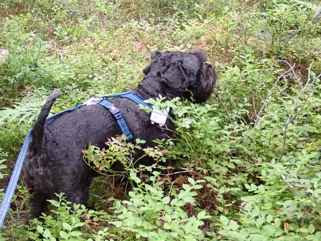 Ganska snart när vi kommit bort från landsvägen får vi vara på fri tass. Jag är precis lagom hög för att kunna gå in under blåbärsriset och plocka godsakerna.