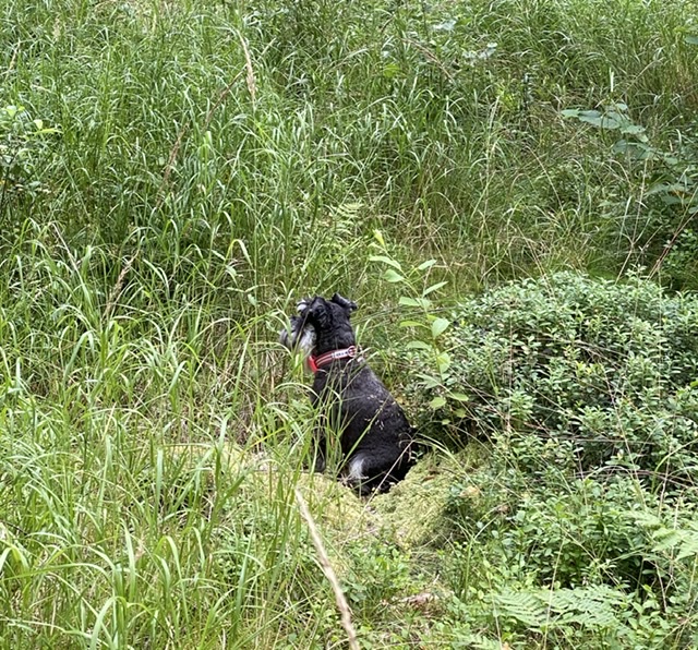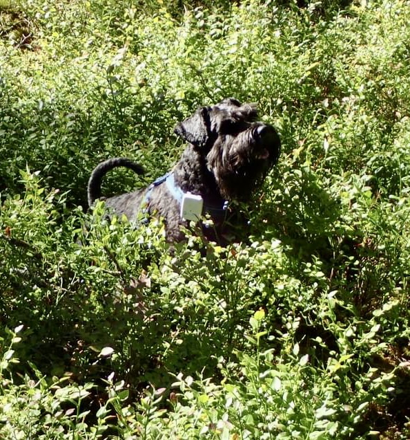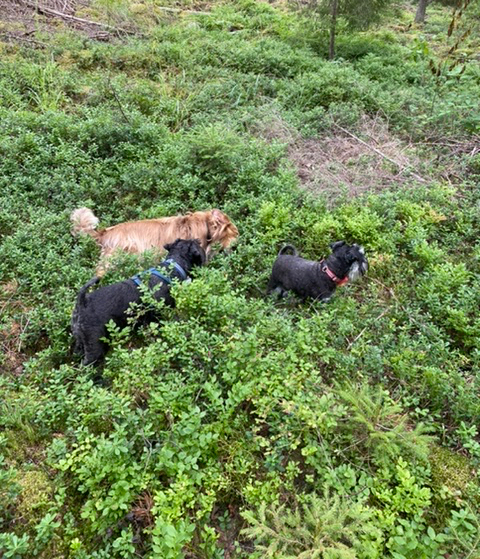 Mot slutet av promenaden blev Troy lite trött så han satte sig och vilade i blåbärsriset. Matte ser du mig frågade han. Jo sa matte lilla älsklingen jag ser dig!! Vet ni ibland gör han sig till och fjäskar något alldeles osedvanligt för att få lite godis och matte trillar dit varje gång.