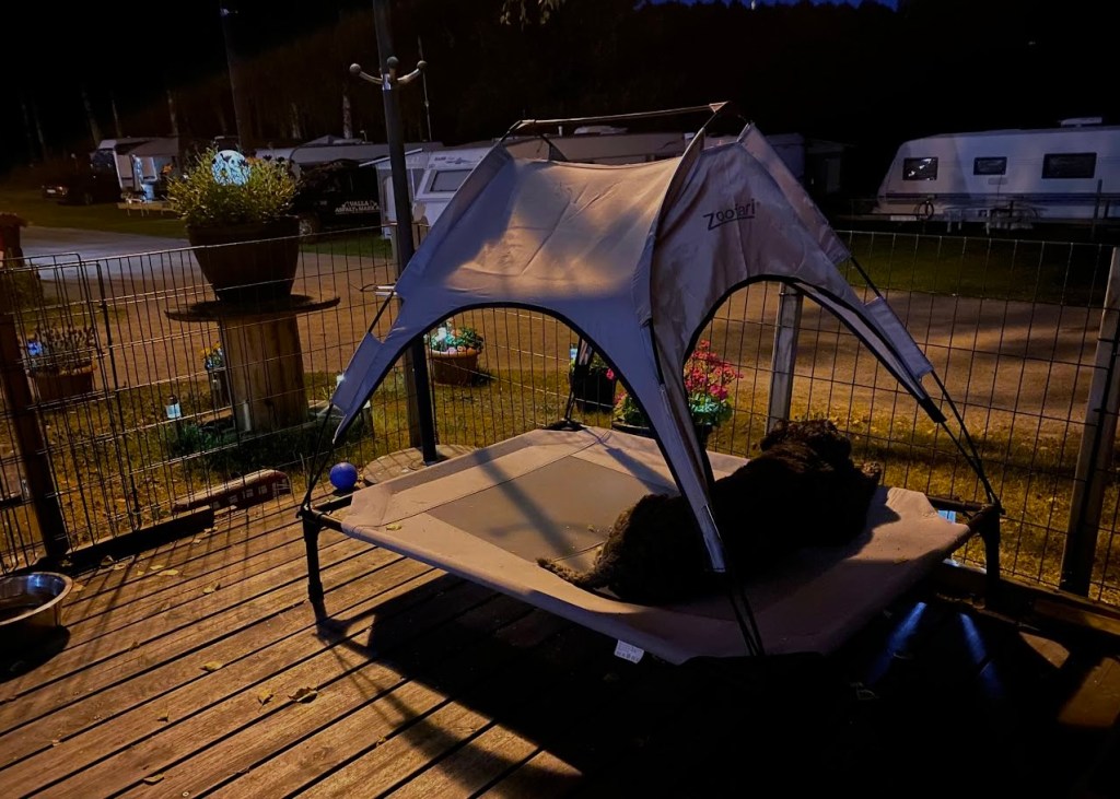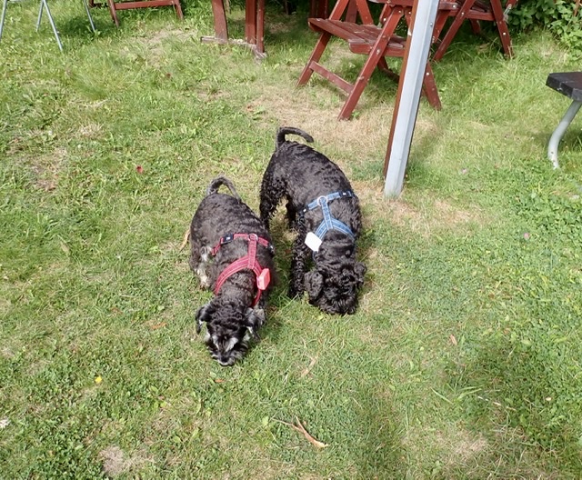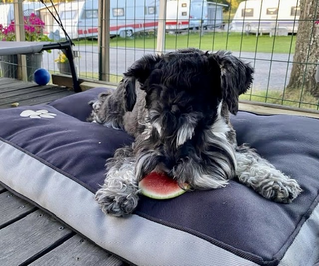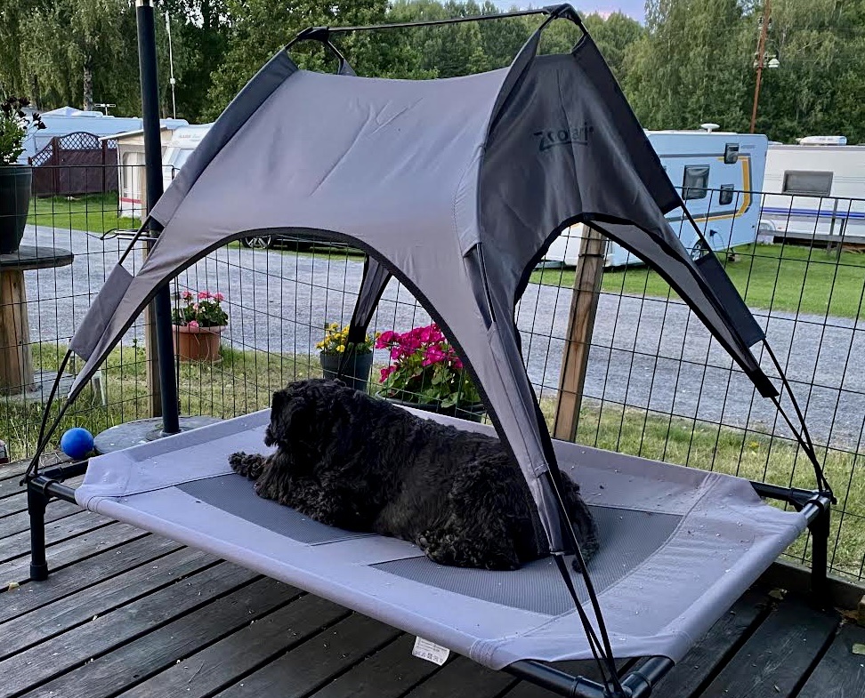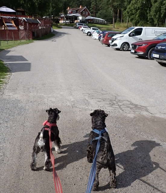 Kvällen avslutades med ett svalkande dopp vid campingens hundbad. Lördagen kommer att helt och hållet gå i slöandets tecken. Vi får bara försöka överleva hettan med kortare promenader.