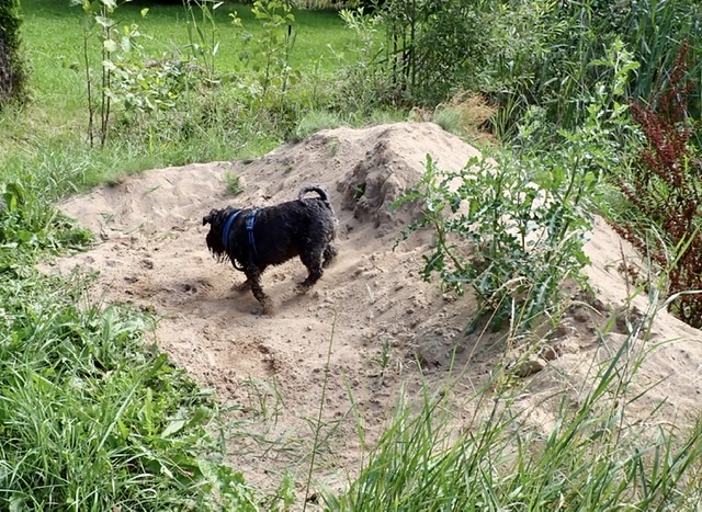 Sen rumlar man om ordentligt i sandhögen. Hela kroppen skall gnidas in ordentligt med sand. Det är nog bra med sandpeeling för både hud och päls.