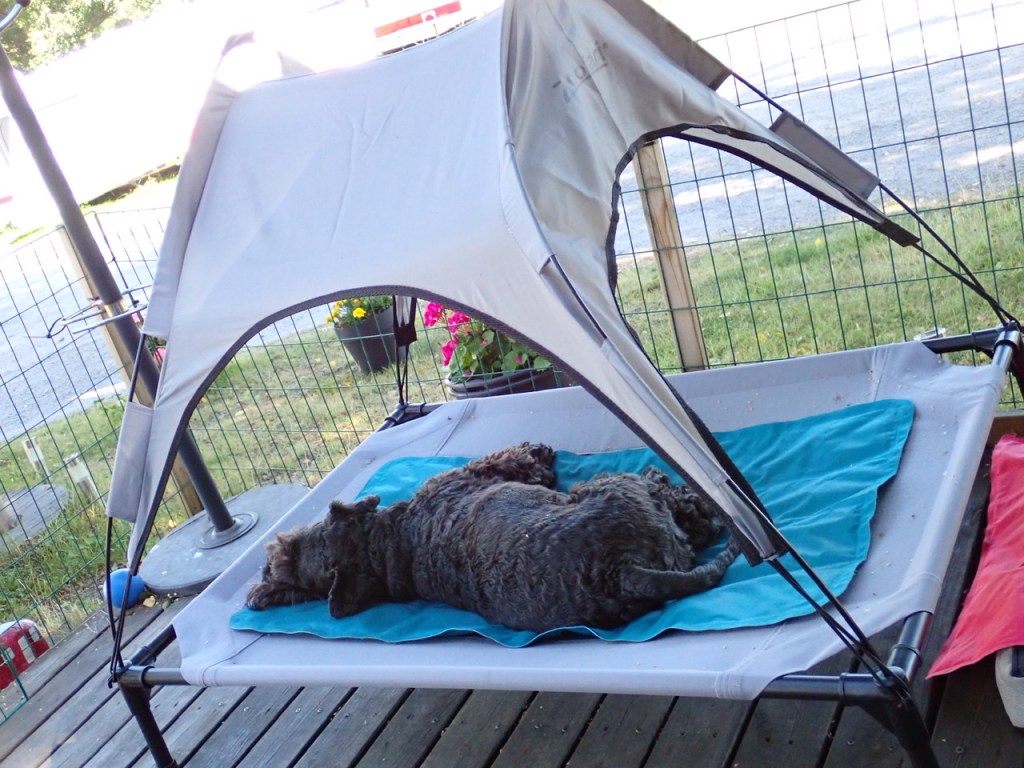 Äntligen lite svalare. Troy intar sin himmelssäng och njuter. Nu tror jag att kvällsbrisen kommer det är skönt.
