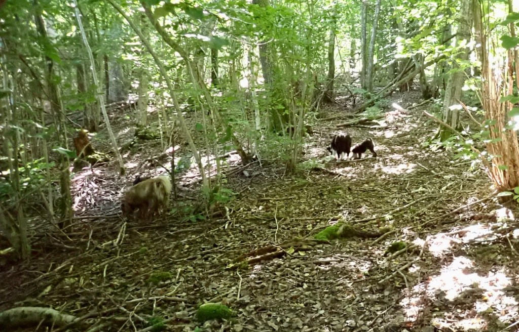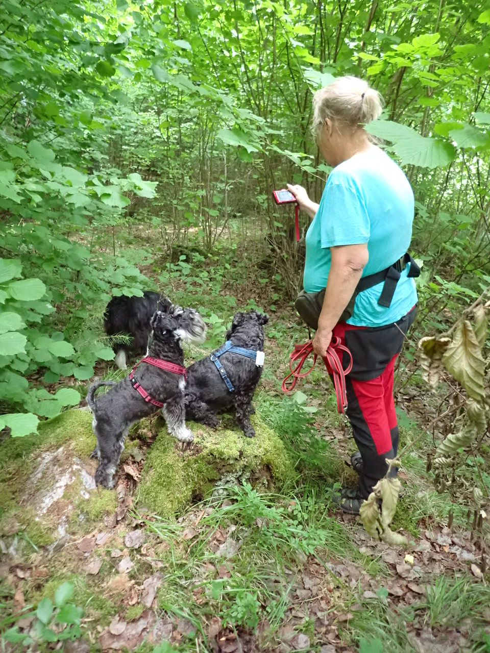 Nu är det varmt, mycket varmt så vi håller till i skuggan i skogen. Matte håller fast oss fyra och Helena försvinner iväg. Nu vet vi, det är spår på gång som slutar med godissök. Wilma och jag sitter tålmodigt och väntar. Basse skäller oavbrutet och Troy låter som om någon blåser hysteriskt i en visselpipa. Helena kommer tillbaka och så släpps vi tjejer loss först för vi tar det lugnt och metodiskt när vi följer spåret. Killarnas körsång stiger till oanad styrka, de vrålar över orättvisan sätt vi fick ett försprång. Sen släpps killarna som far iväg i 180 och vi kommer samtidigt fram till spårslutet. Där finns det korvsnuttar utspritt och vi jobbar hårt för att hitta allt.
