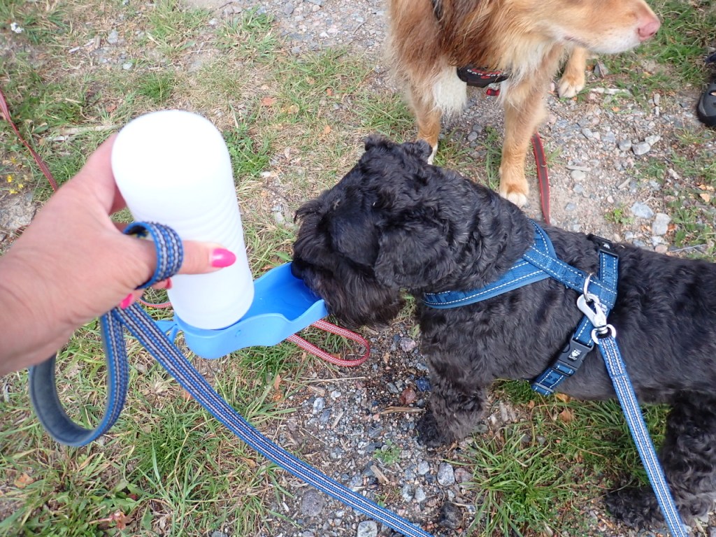 Det var mycket torrt i skogen så vi hittade inte något gott skogsvatten. När vi kom tillbaka till bilarna tog matte fram vattenflaskan med drickskålen. Vi var så törstiga att vi tömde en hel vattenflaska.