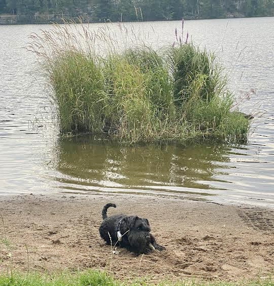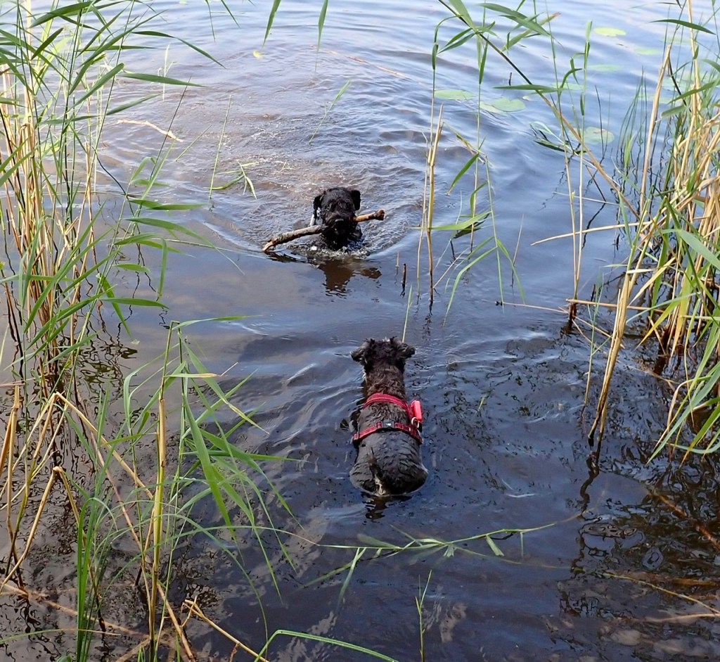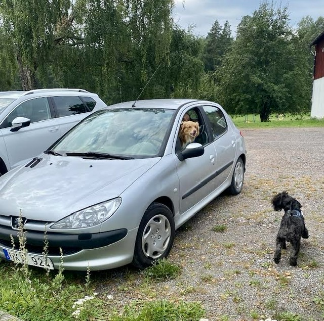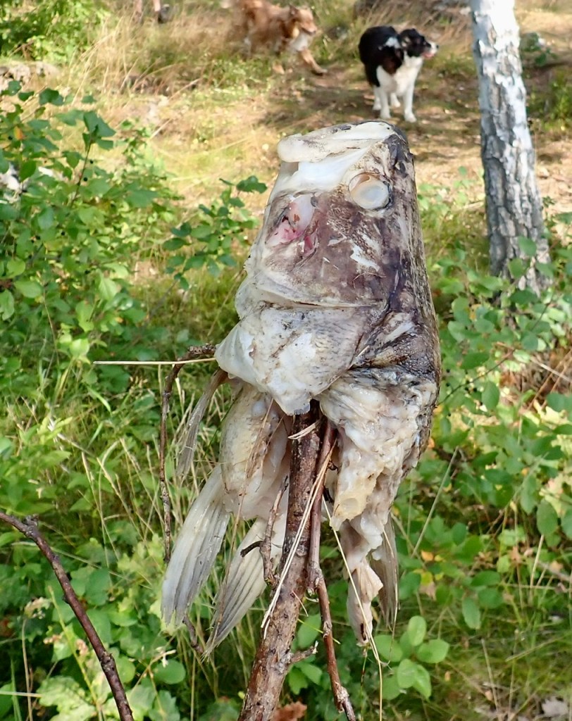Vi åkte till hemgården i Sparreholm för där finns en halvö som i denna hetta är perfekt för lite lek och bad. När vi kom dit stack Basse och Troy i väg för de hade känt en doft av något intressant. Först började Basse med att köra ett ryggrull sen tog Troy över. Först ned och gnugga kinden i något och sen samma procedur med halsen för att sen avsluta med att vrida sig runt och riktigt gnugga ryggen mot detta något. Allt detta skedde medans matte förgäves ropade på honom och rusade dit. För sent skulle jag säga och matte sa inga vackra ord när hon fått undan honom och såg vad det var som var så lockande för de båda busarna. Ett halvruttet fiskhuvud av modell större.