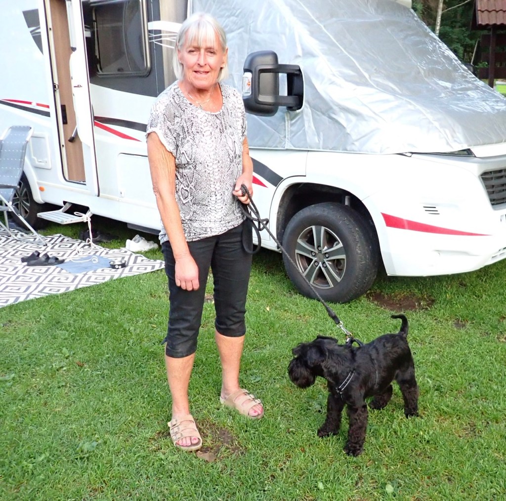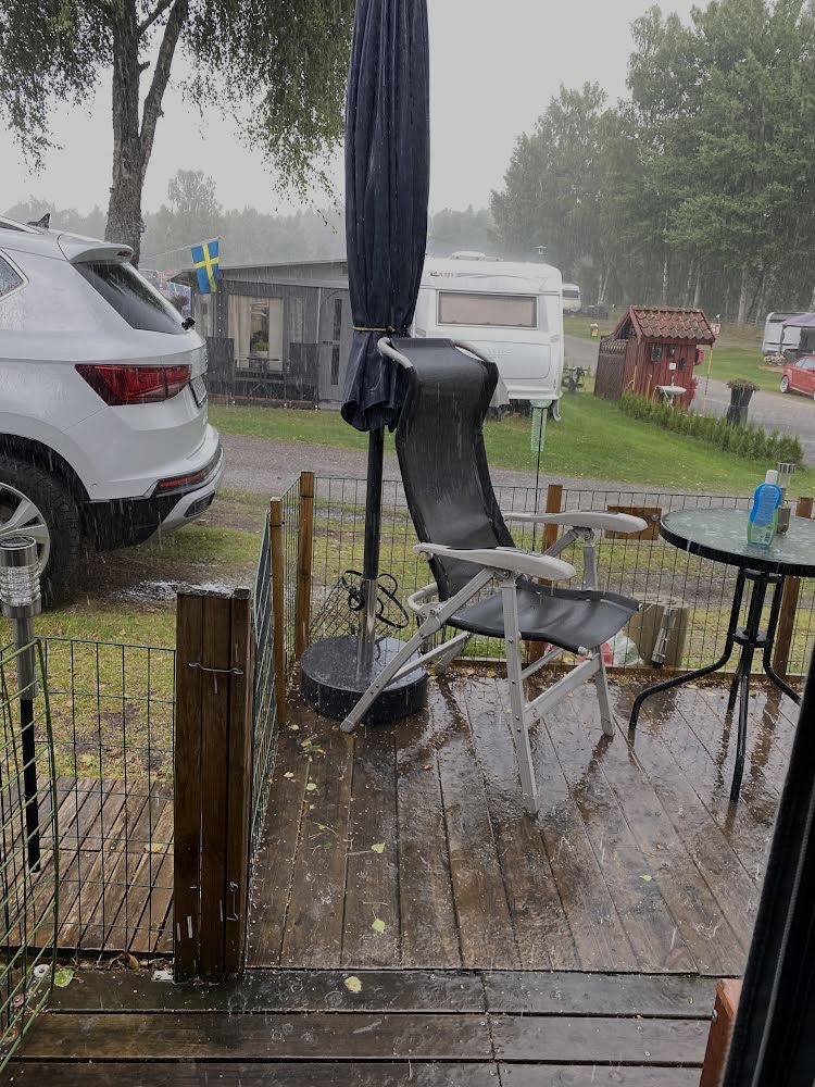 Halleluja… nu åskar och regnar det, ja det riktig öser ned. Jag kutar i full fart in i förtältet och dyker med huvudet före in i kojan. Troy rusar in i vagnen och hoppar upp i mattes säng. Hoppas det blir lite svalare efter regnet för 30 g i skuggan är liiite för mycket. Lika plötsligt som regnet kom lika snabbt slutade det. Å då när solen kom tillbaka blev det nästan som en ångbastu.