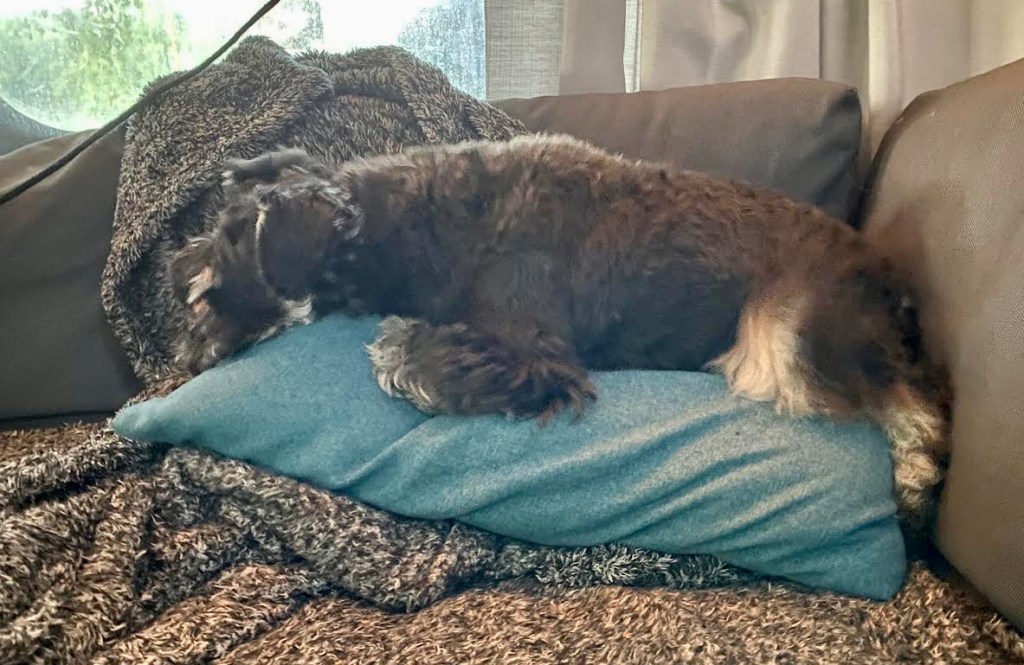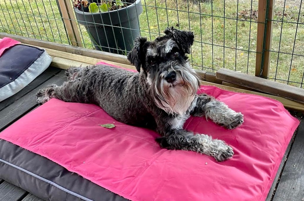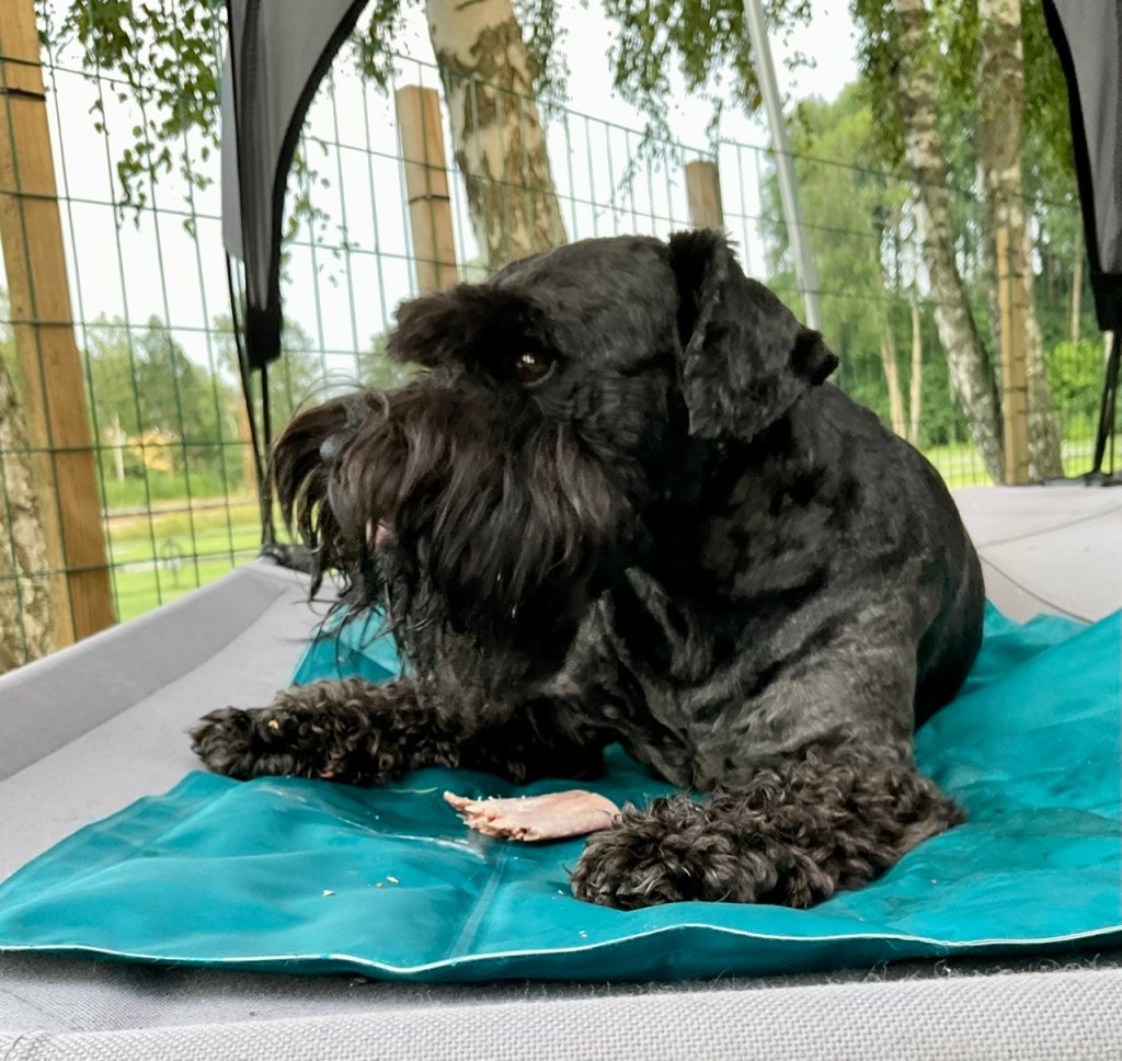 Nu börjar det regna och då snor jag snabbt åt mig den bästa kudden. Det är ganska mysigt att ligga i förtältet och höra smattret på taket. Jag tror att jag tar mig en eftermiddagslur. Matte du kan väl väcka mig när det är dags för middag?