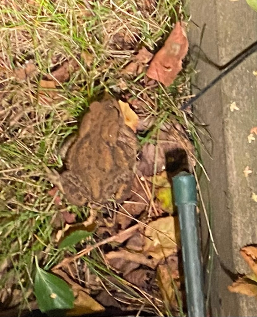 Husse och matte undrade vad vi markerade på. Det tog en lång stund innan tvåbeningarna förstod att det satt en liten brun groda utanför staketet på vår altan. Konstiga saker de däringa grodorna. Vi fick inte gå ut och snacka med den så den satt kvar länge. Måste komma ihåg att kolla om den sitter kvar i morgon.