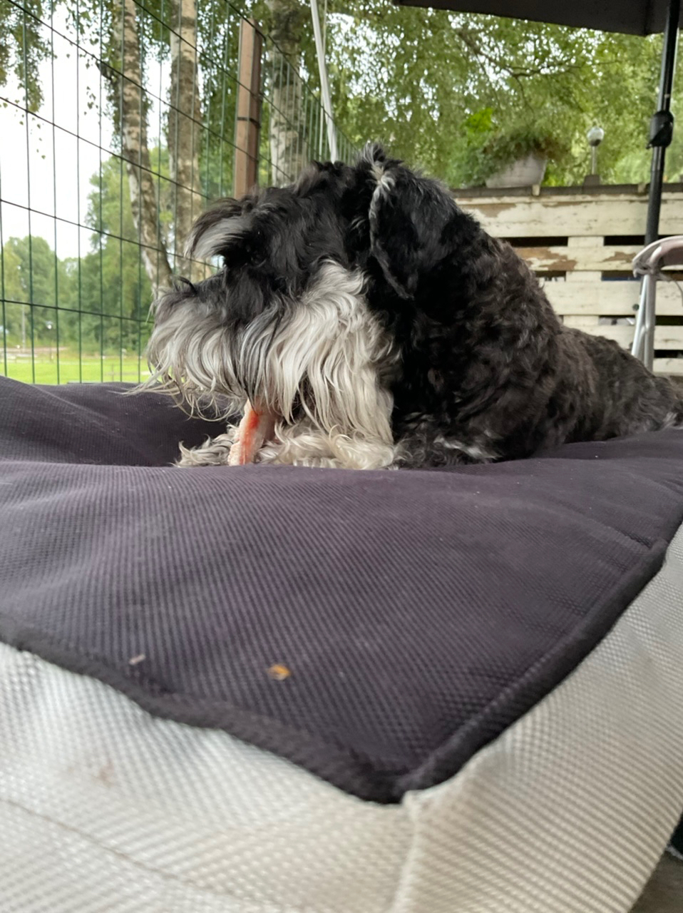 När det är så här varmt är det skönt att på kvällskvisten ligga i skuggan och tugga på en dentastix.