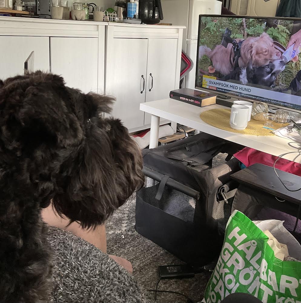 Hör ni….. det är ju Helenas röst jag hör och någon nämner Basses namn, men var är de? Troy hoppar upp i soffan mellan matte och husse. Å titta där är dom säger han, de är i den där lilla burken men hur går det till. De är med i TV4 Nyhetsmorgon och berättar om hur man kan få oss vovvar att leta efter svamp. Basse har en kamera på ryggen. Troy tittar uppmärksamt.