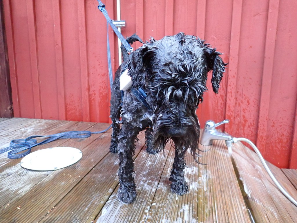 Han stinker något så hemskt och även selen är kontaminerad och då va, då hamnar man i hundduschen. Det krävdes två schamponeringar och det gick åt en halv flaska hundschampo för att sanera honom. Jag kan berätta att han blev inte helt lycklig över intvålningen men han slutade i alla fall att stinka. Selen fick också sig en omgång med både tvättmedel och diskmedel.