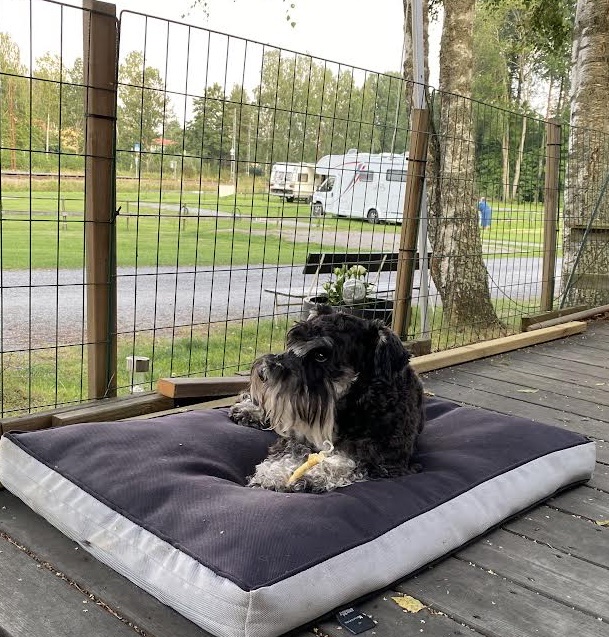Kväll och lugnet råder på campingen. Då är det gott med en tuggsticka. Jag tuggar av en bit i taget och njuter av varenda bit men så gör inte glupska Troy. Matte får ta och dra ut den långa mjuka biten som nästan sitter fast i halsen på honom. Sedan delar hon den i tre delar med hjälp av en sax. Så då kan han smaska vidare.