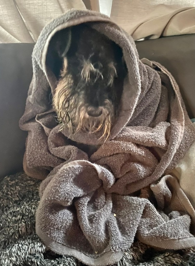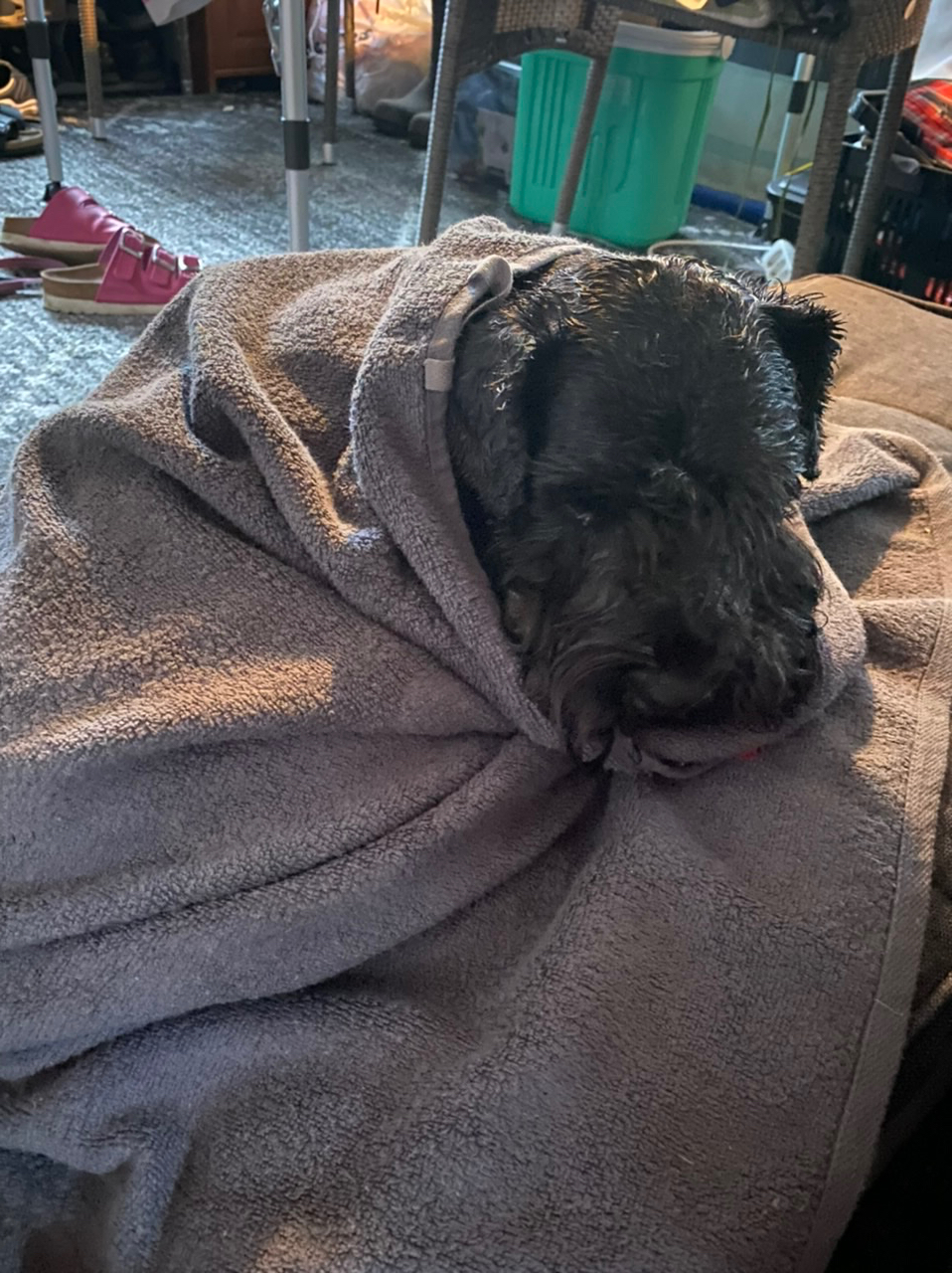 Det regnar hela natten och vi vill inte gå ut. Till sist släpar matte ut oss efter att vi fått på oss regntäckena. Tillbaka i förtältet gosar vi in oss.