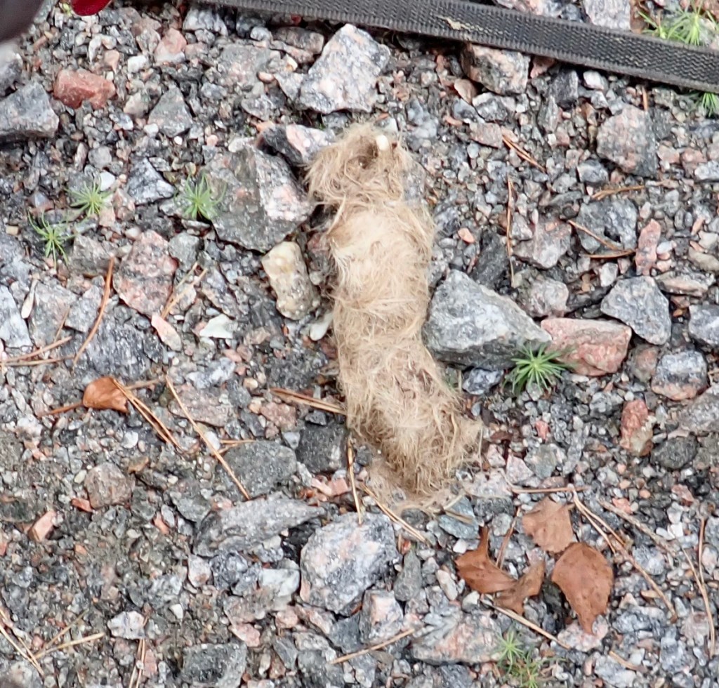 Kolla här det är en varg som lämnat rester efter en måltid på någon. Det var ju det vi alla fyra sa att det var något här som man måste vara uppmärksam på.