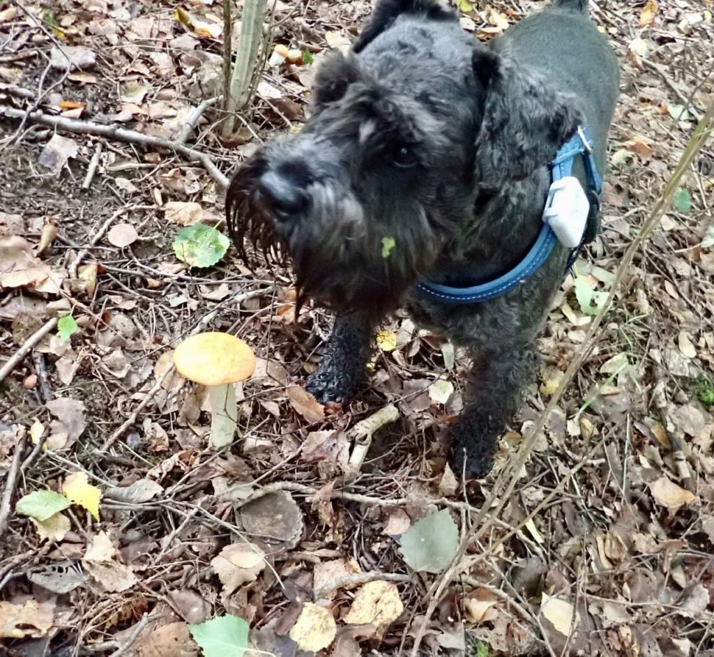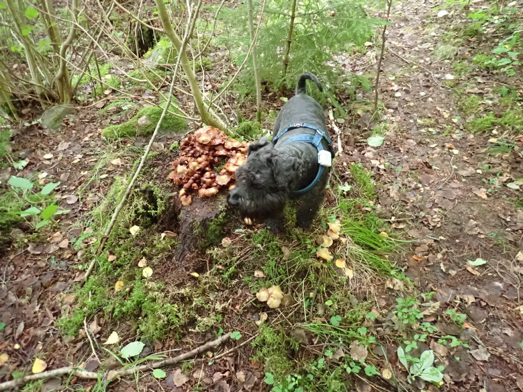 Denna stubbe med föränderlig tofsskivling kallas numer för Troys stubbe. Han rusar dit och markerar svampen varje gång vi är i den här skogen. Han vet att när man gör det då blir det lite ost från tuben.