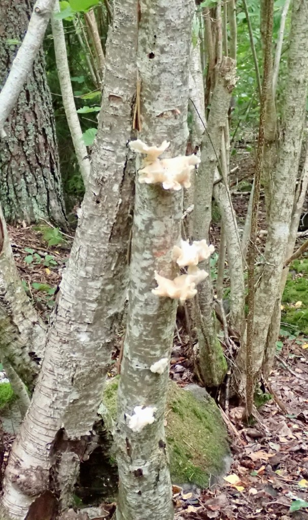 Kolla det växer ostronmussling på trädstammen. Den och björksoppen fick följa med hem