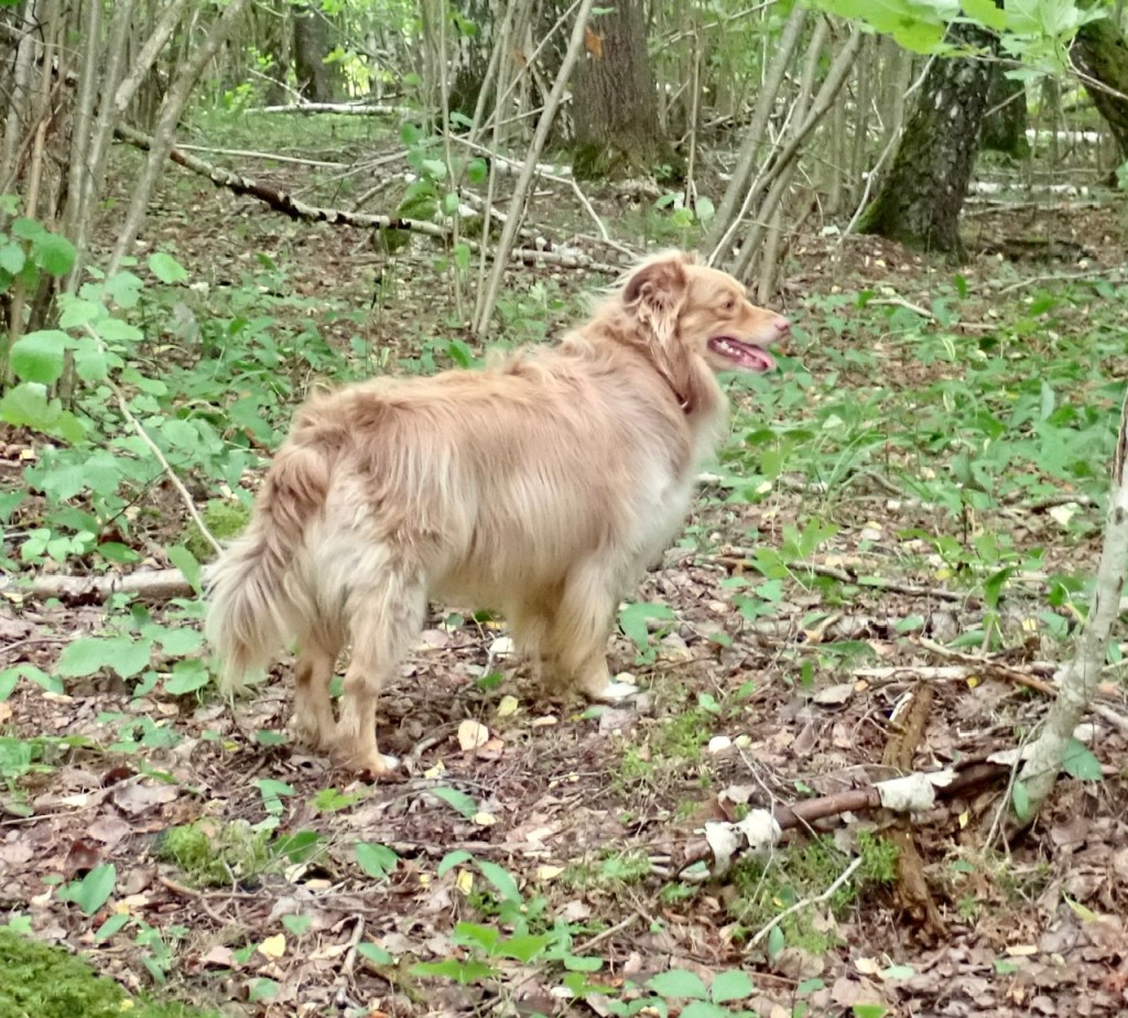 Helt plötsligt från ingenstans uppenbarade sig Basse. Vad sa matte, är du på rymmen frågade hon. Matte ringde till Helena och hon berättade att de var i samma skog. Så stack han iväg så jag och Troy följde efter. Men vi tyckte att vi kom för långt ifrån matte och ni vet hon irrar ju bort sig om man inte har ögonkontakt. För att vi skall slippa leta efter henne vände vi om. Men vi vill ju samla hela gänget så vi sa till matte att häng på nu så letar vi upp dem. Vi hittade dem efter en liten stund vilket bara är som det ska.