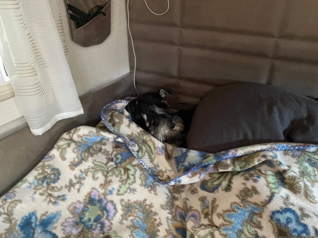Troy har en ny favorit plats på en hög med kuddar framför kaminen.